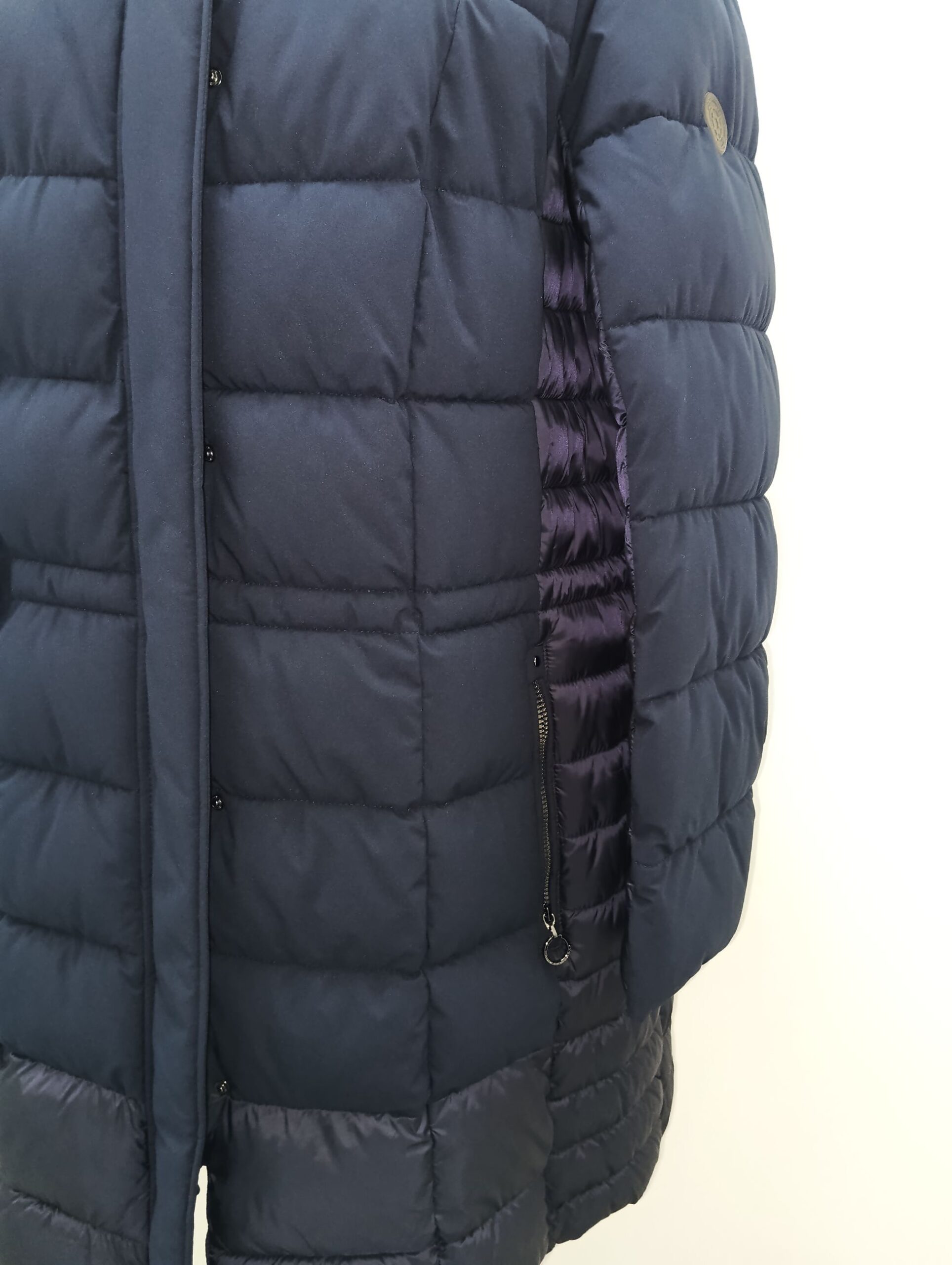 Piumino lungo trapuntato chiusura bottoni e zip doppio cursore cappuccio staccabile fasce lucide laterali e centrali opache tessuto Down Optic Free