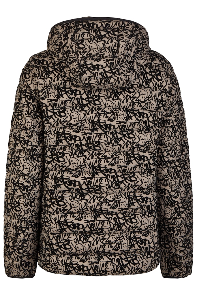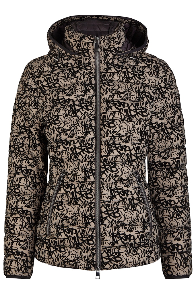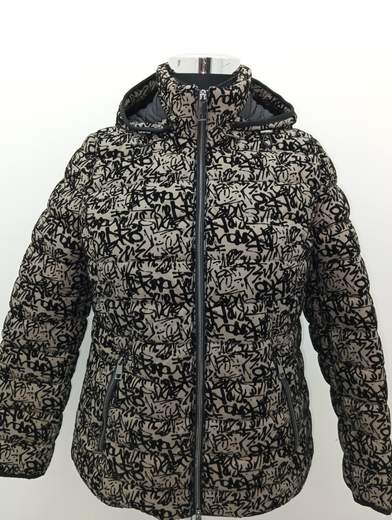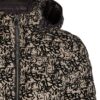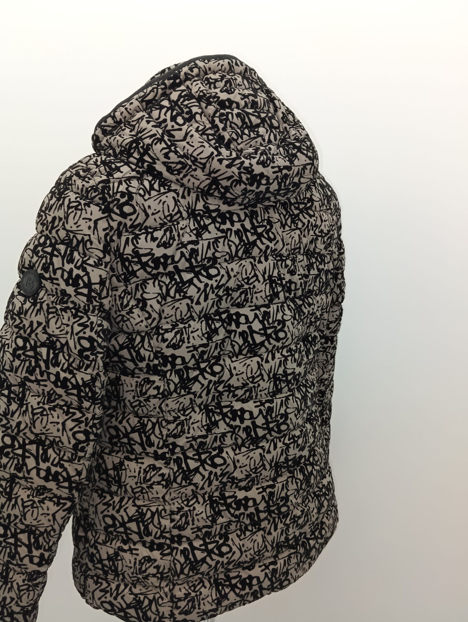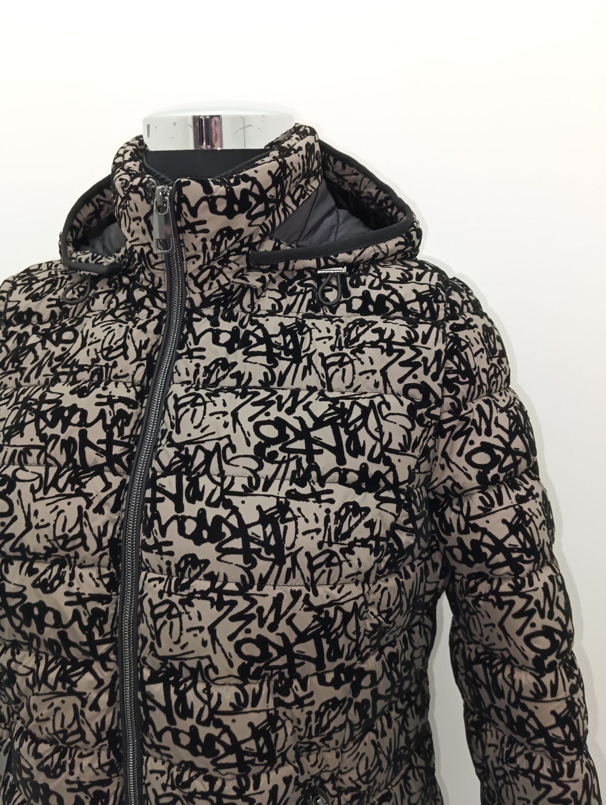 Piumino donna corto down free chiusura con zip doppio cursore tasche con zip tessuto effetto damascato con inserti in velluto nero su fondo chiaro cappuccio staccabile tessuto in maglia sul collo