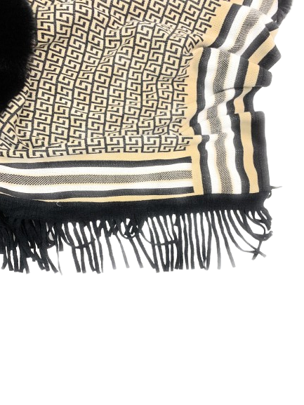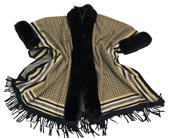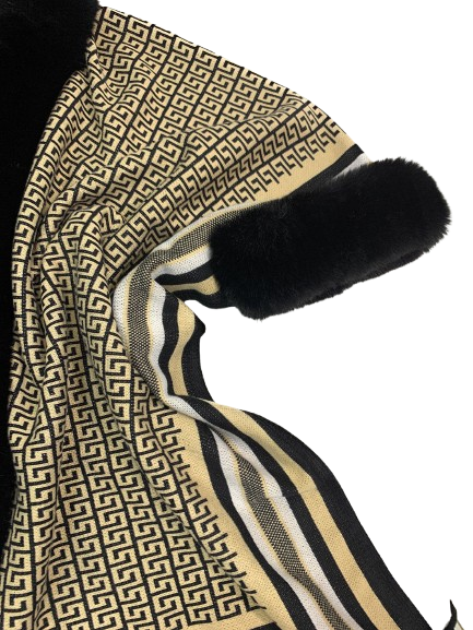 Mantella donna Carla Ferroni in maglia con profilo in eco-pelliccia e frange sul fondo linea oversize taglia unica stampa geometrica
