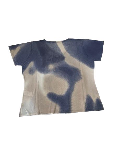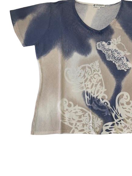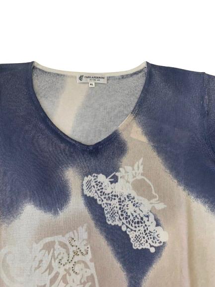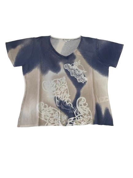 Magia donna Carla Ferroni mezza manica in filo di viscosa con stampa floreale degradè sui toni jeans e beige con applicazione di strass