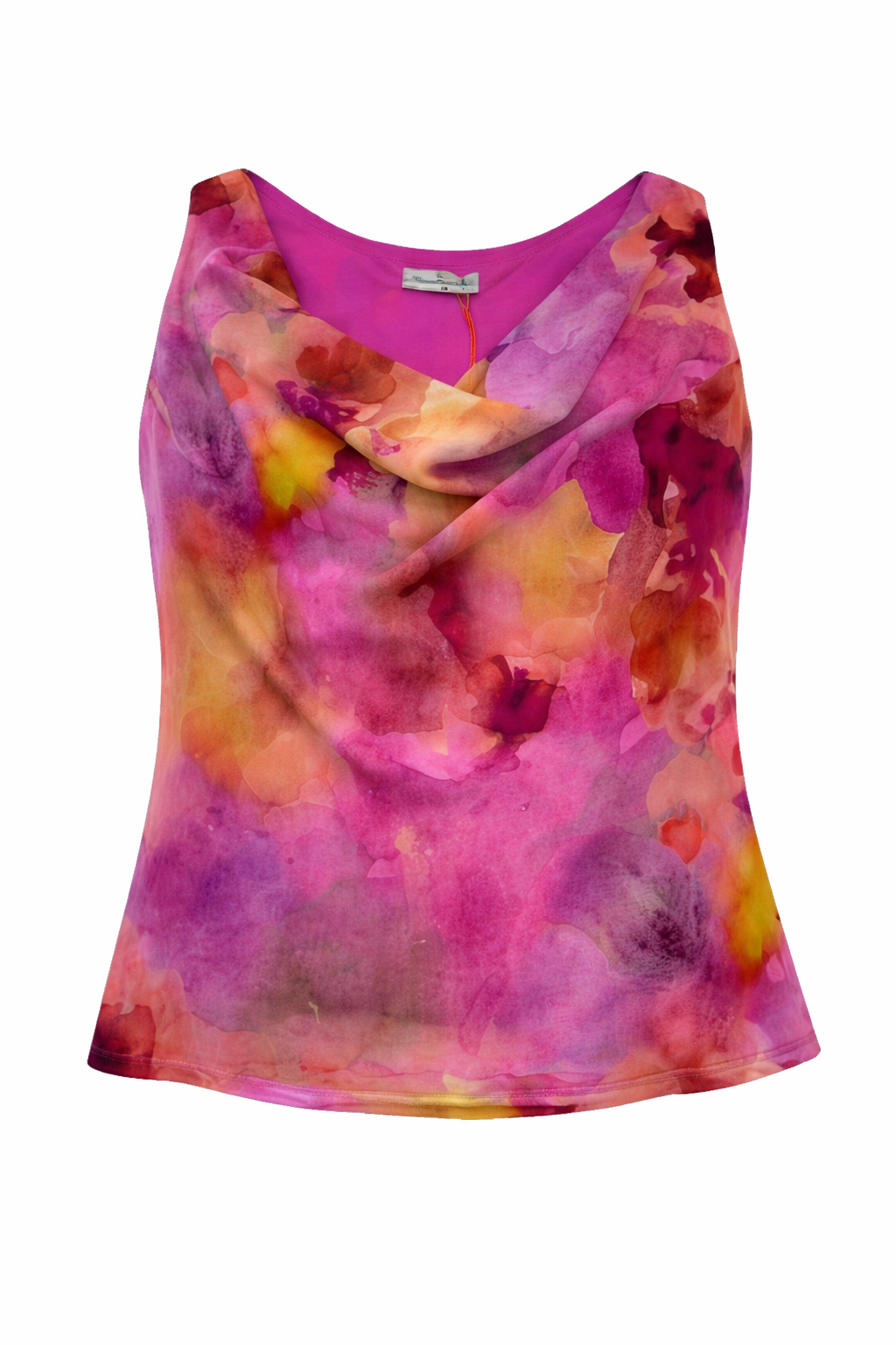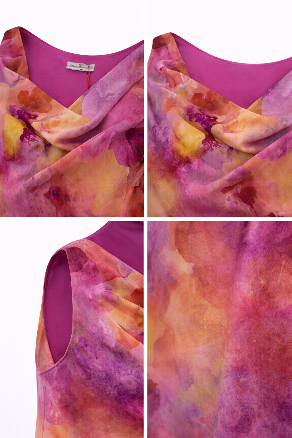Il design si distingue per lo scollo drappeggiato che crea un effetto morbido e sofisticato, valorizzando il décolleté senza risultare eccessivo. La stampa effetto acquerello, con sfumature armoniose di rosa, fucsia, arancio e giallo, rende ogni capo unico e luminoso.