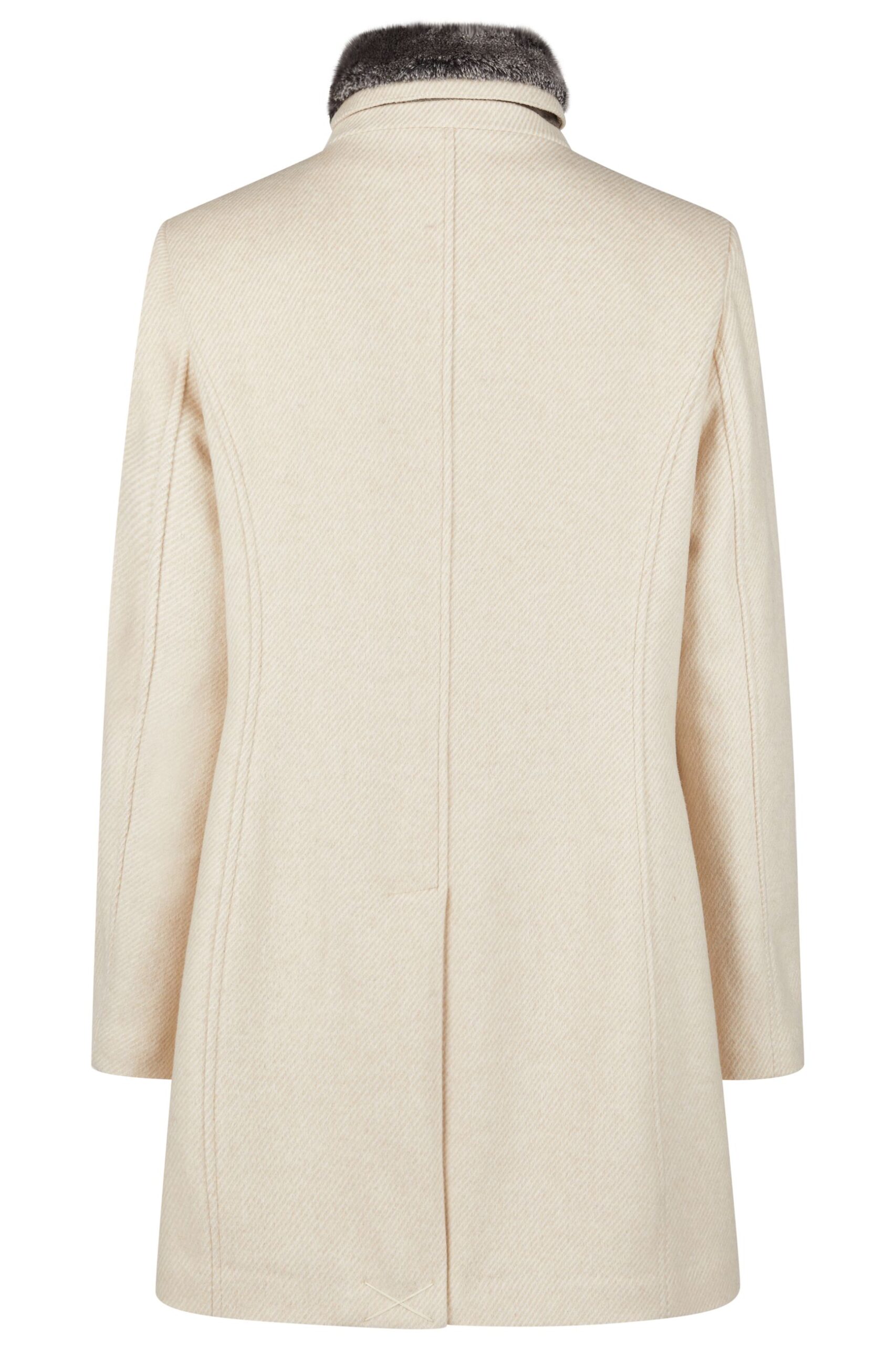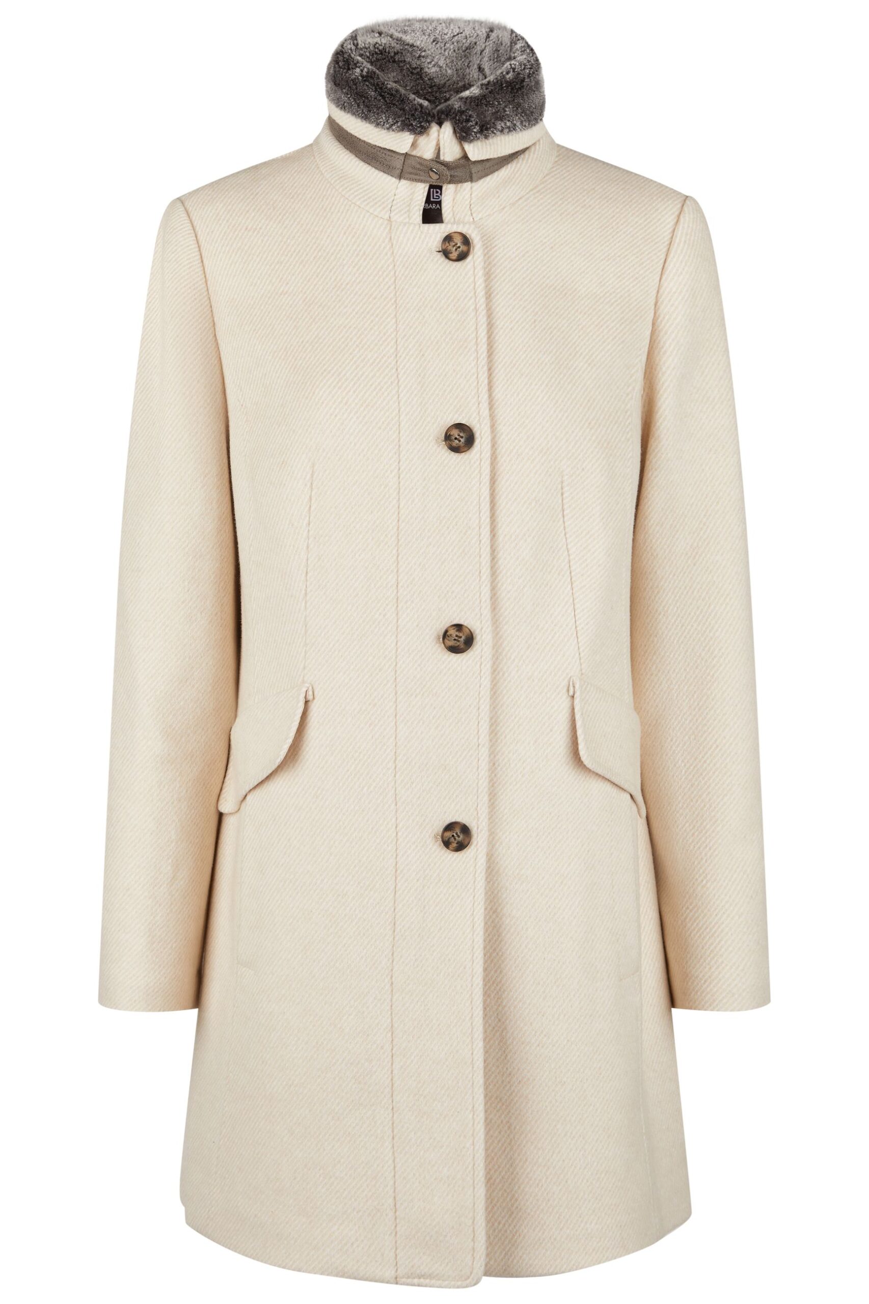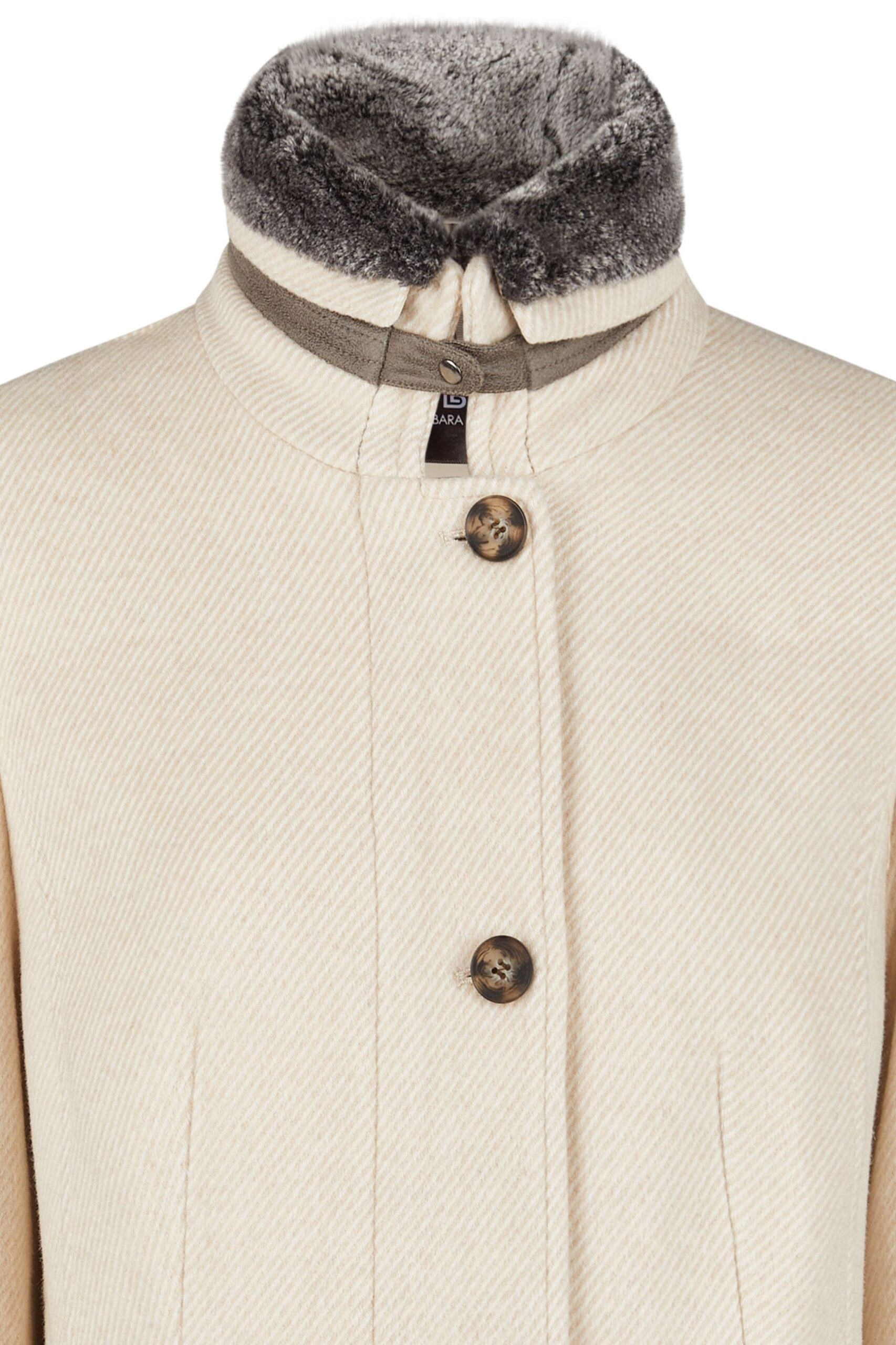 Cappotto donna Barbara Lebek in lana tessuto spigato chiusura con bottoni e cerniera tasche laterali coperte con pattine collo a listino con bordo di eco-pelliccia