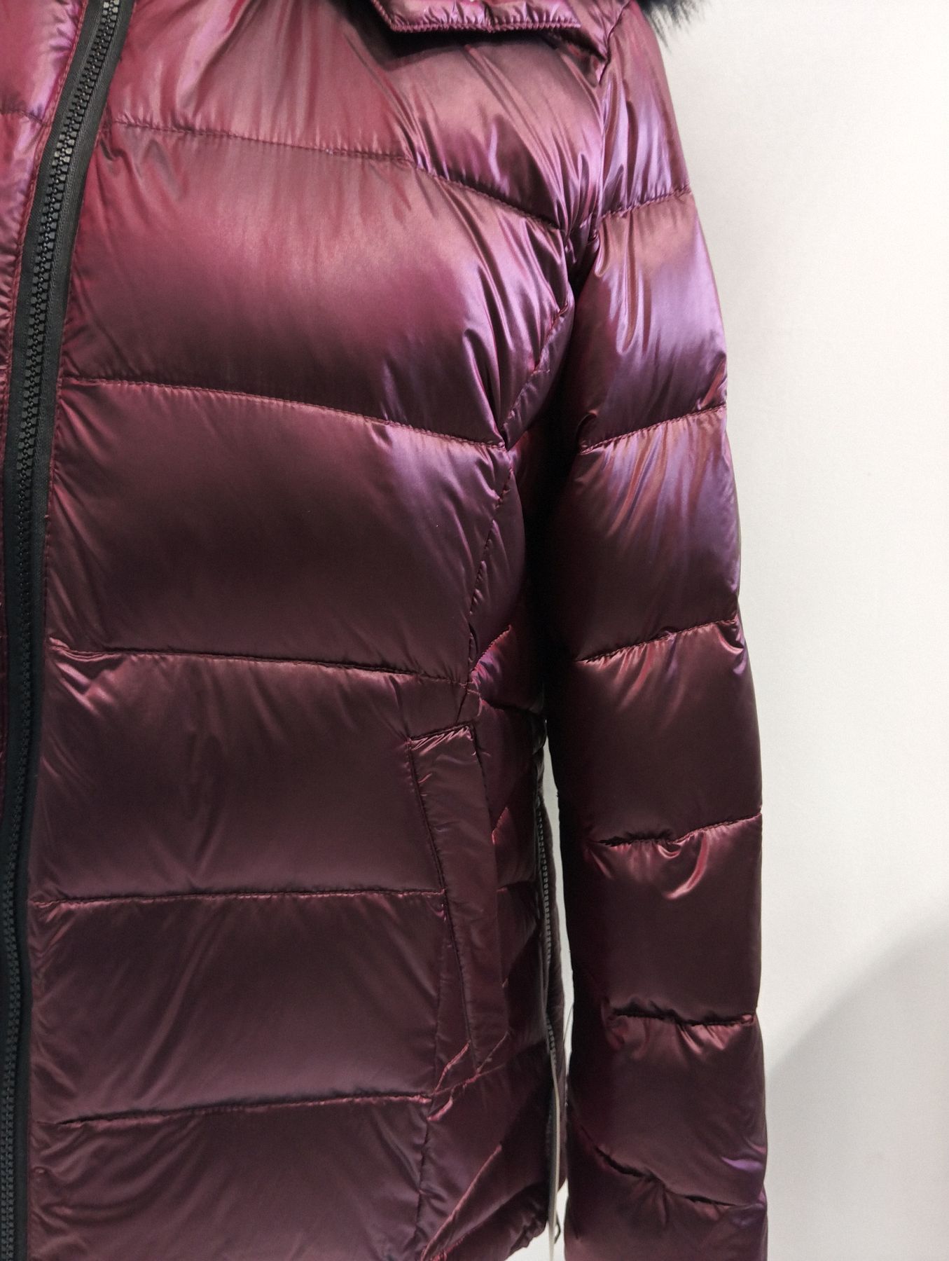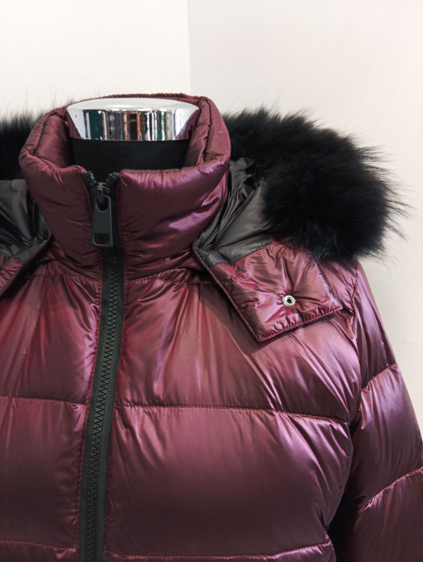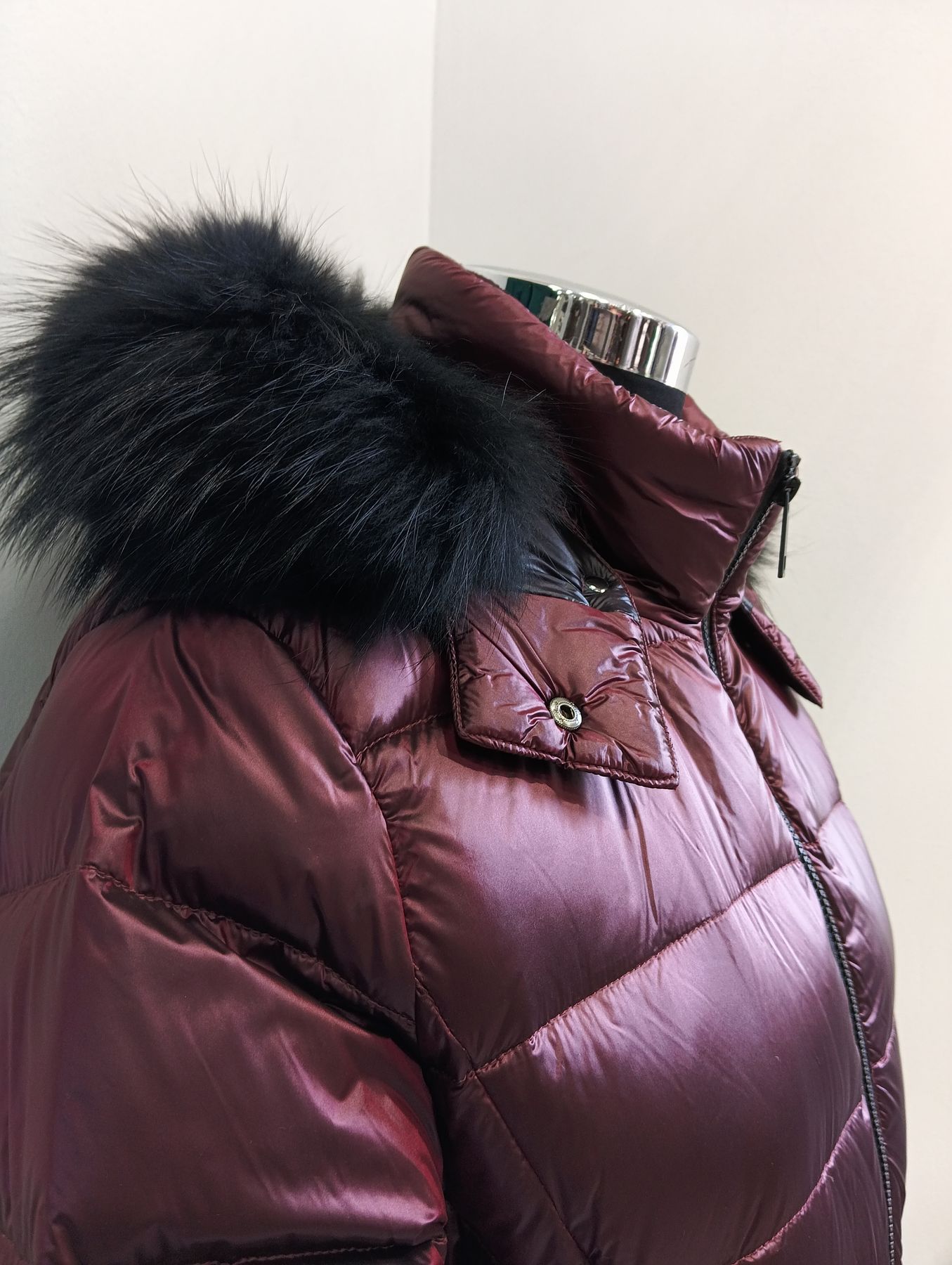 Piumino donna corto tessuto cangiante in piuma d’oca con cappuccio e pelliccia staccabili cerniere laterali pelliccia real fur chiusura con zip doppio cursore tasche con bottone automatico
