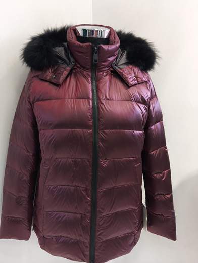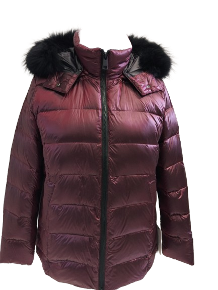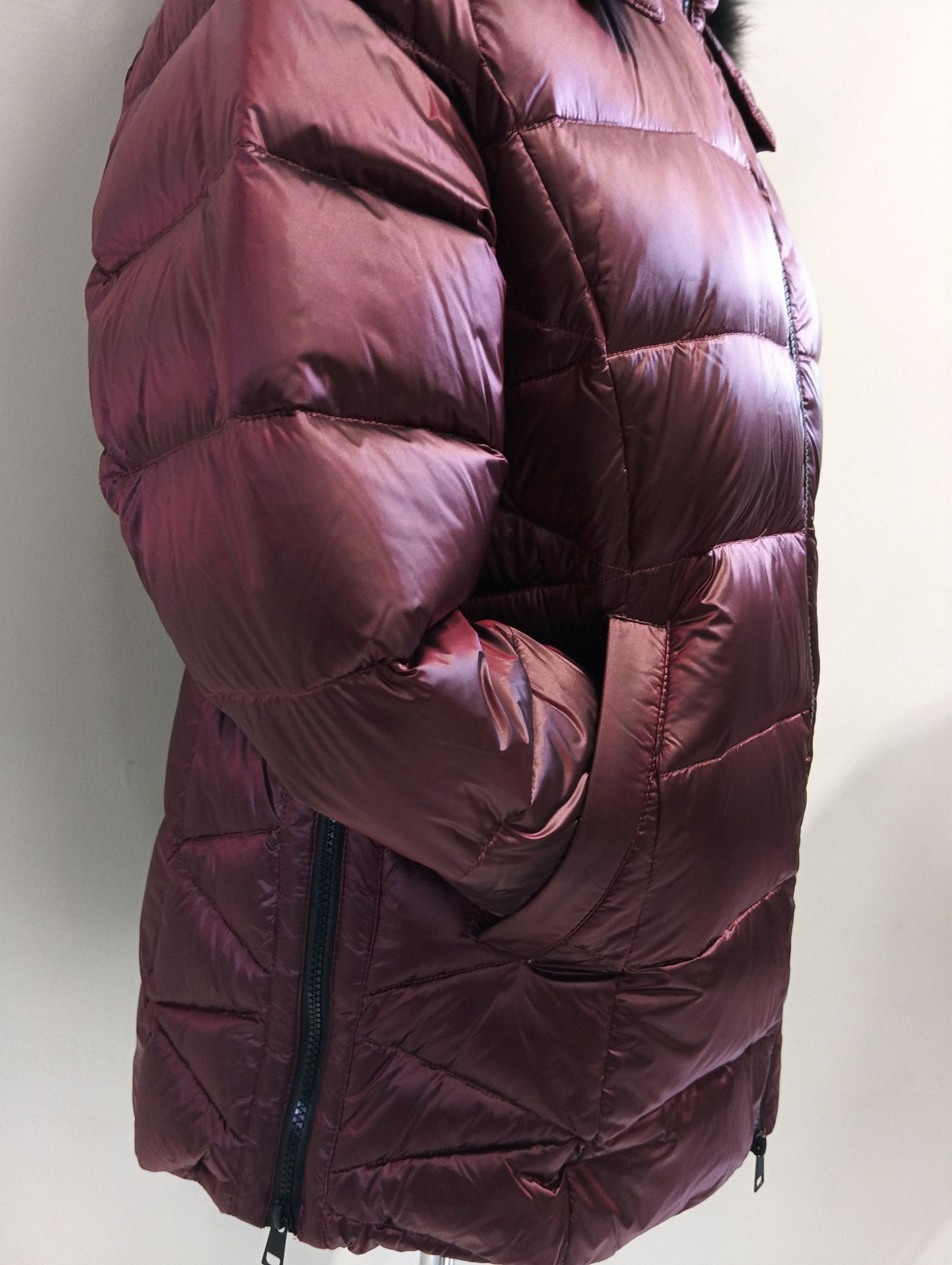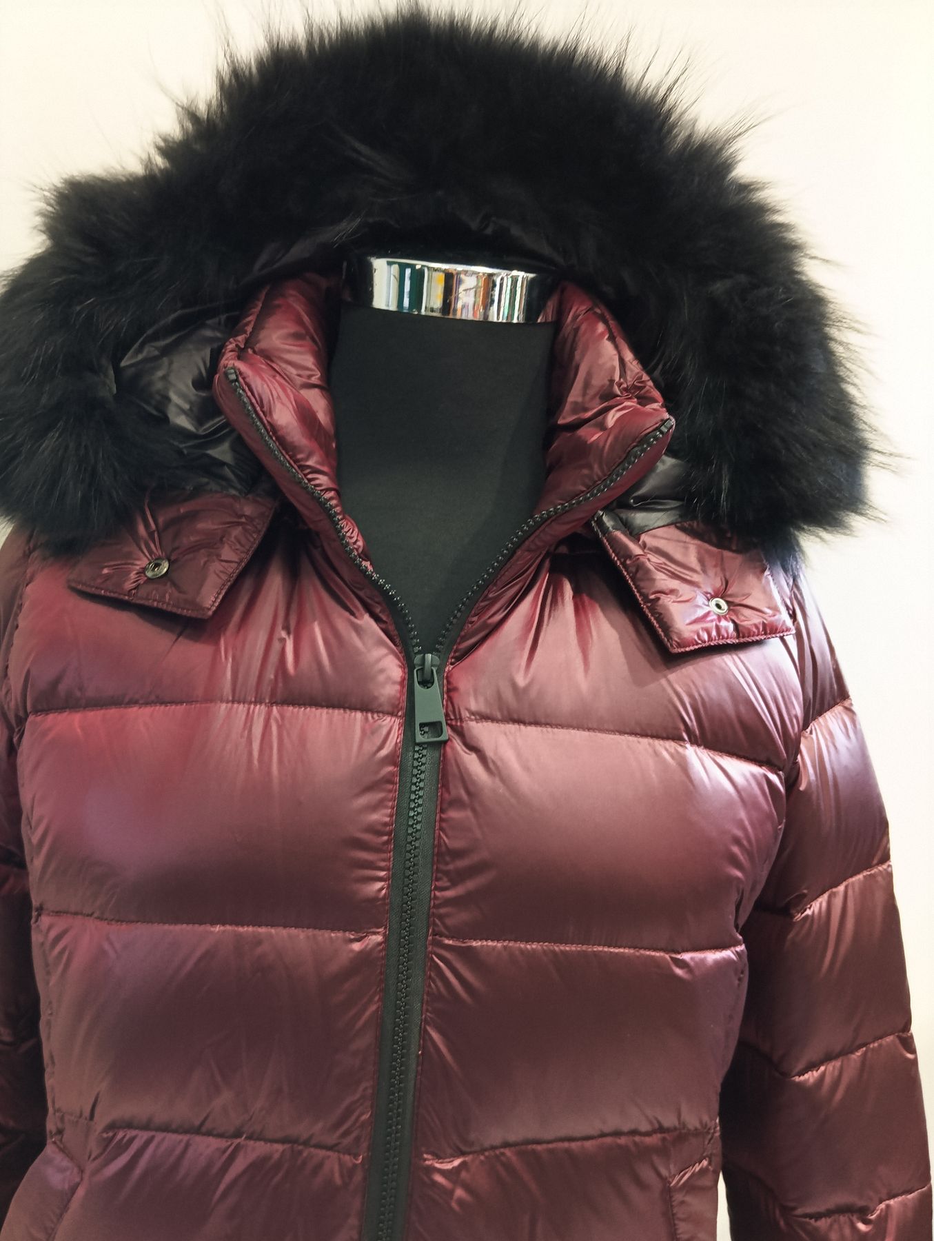 Piumino donna corto tessuto cangiante in piuma d’oca con cappuccio e pelliccia staccabili cerniere laterali pelliccia real fur chiusura con zip doppio cursore tasche con bottone automatico