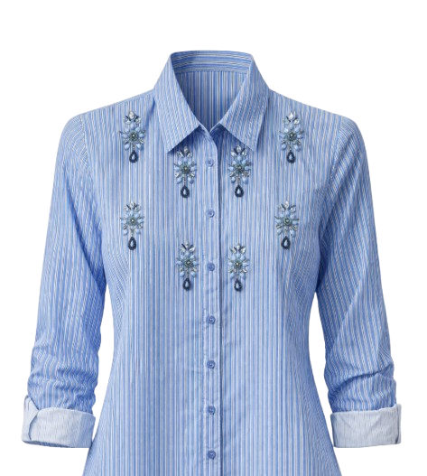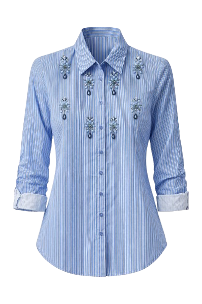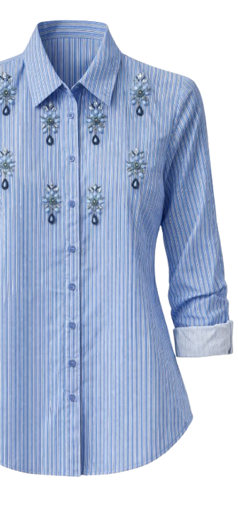 Questa elegante camicia da donna in cotone unisce stile classico e dettagli preziosi, rendendola perfetta per chi desidera un capo raffinato ma versatile. Il design a righe sottili nei toni del blu dona freschezza e luminosità, mentre le applicazioni decorative con pietre e strass aggiungono un tocco glamour e femminile.