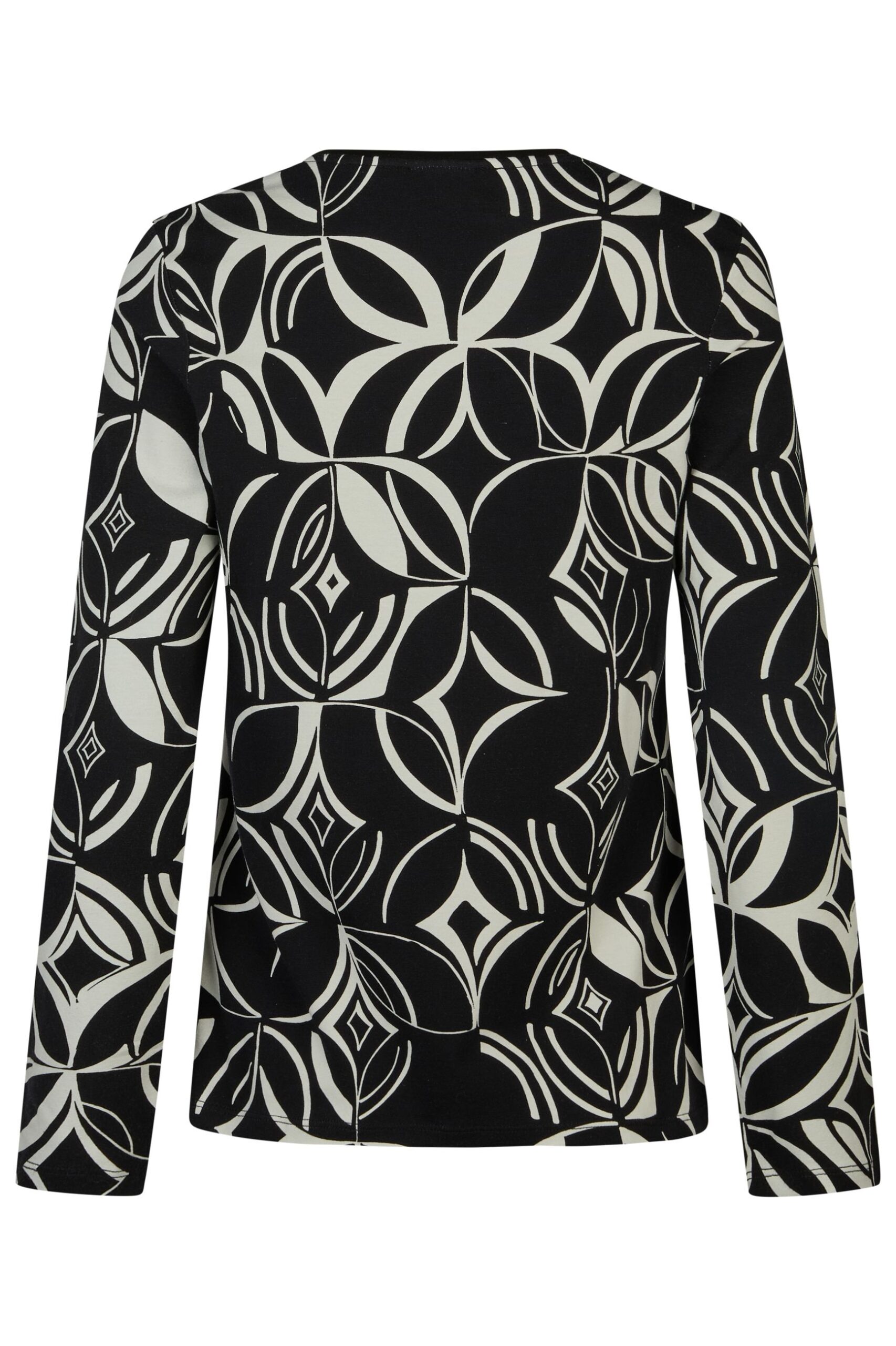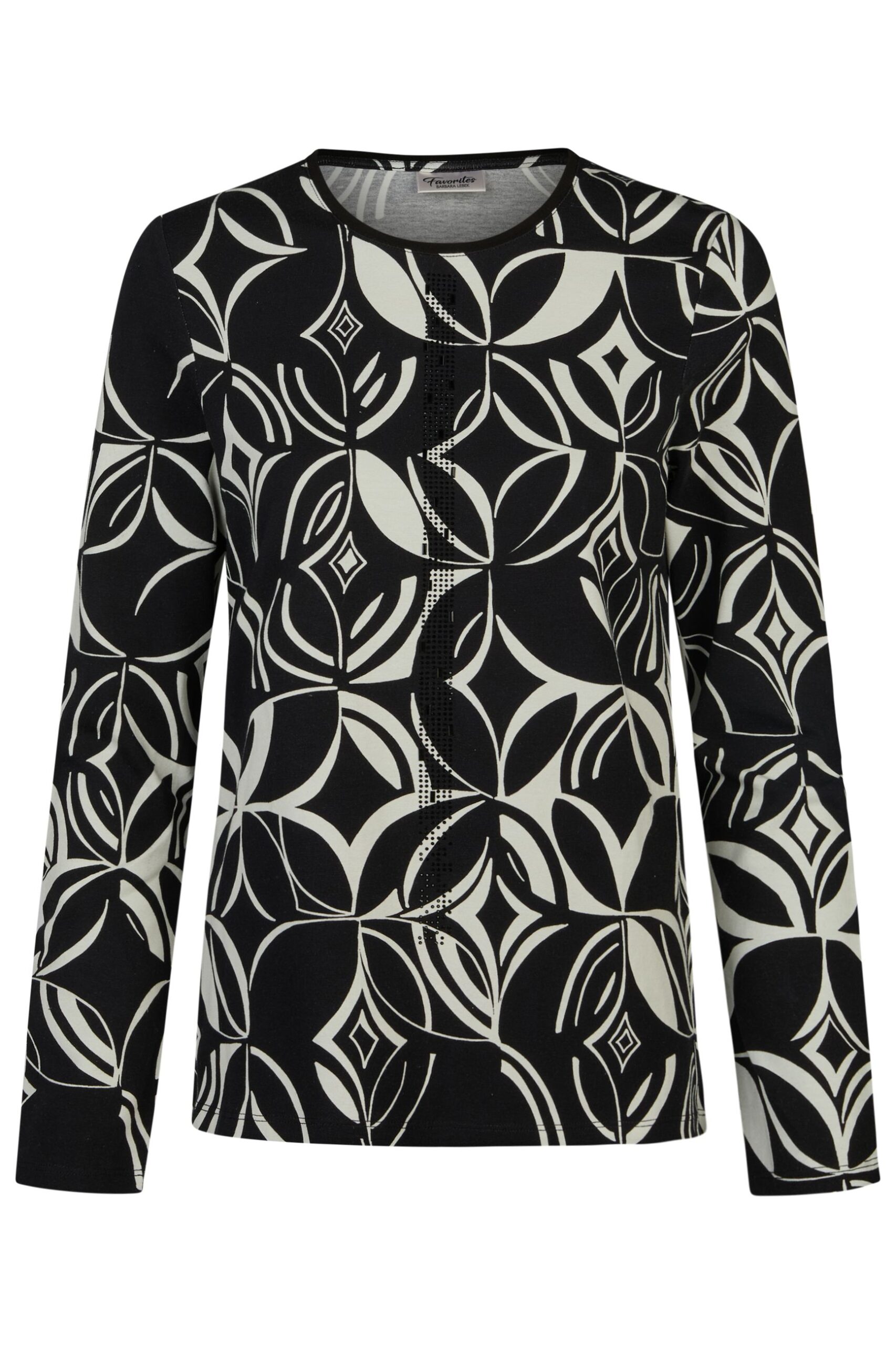 T-shirt donna Barbara Lebek in viscosa manica lunga girocollo tessuto fantasia bianco e nero con applicazione di strass