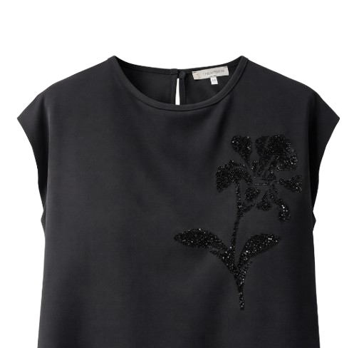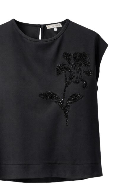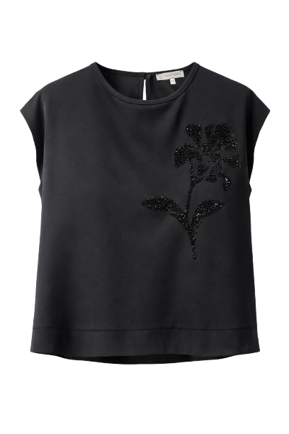 La blusa da donna Carla Ferroni è un capo elegante e versatile, perfetto per chi desidera uno stile raffinato con un tocco moderno. Il design minimal in colore nero viene impreziosito da una delicata applicazione floreale realizzata con strass tono su tono, che dona luminosità ed eleganza senza risultare eccessiva.