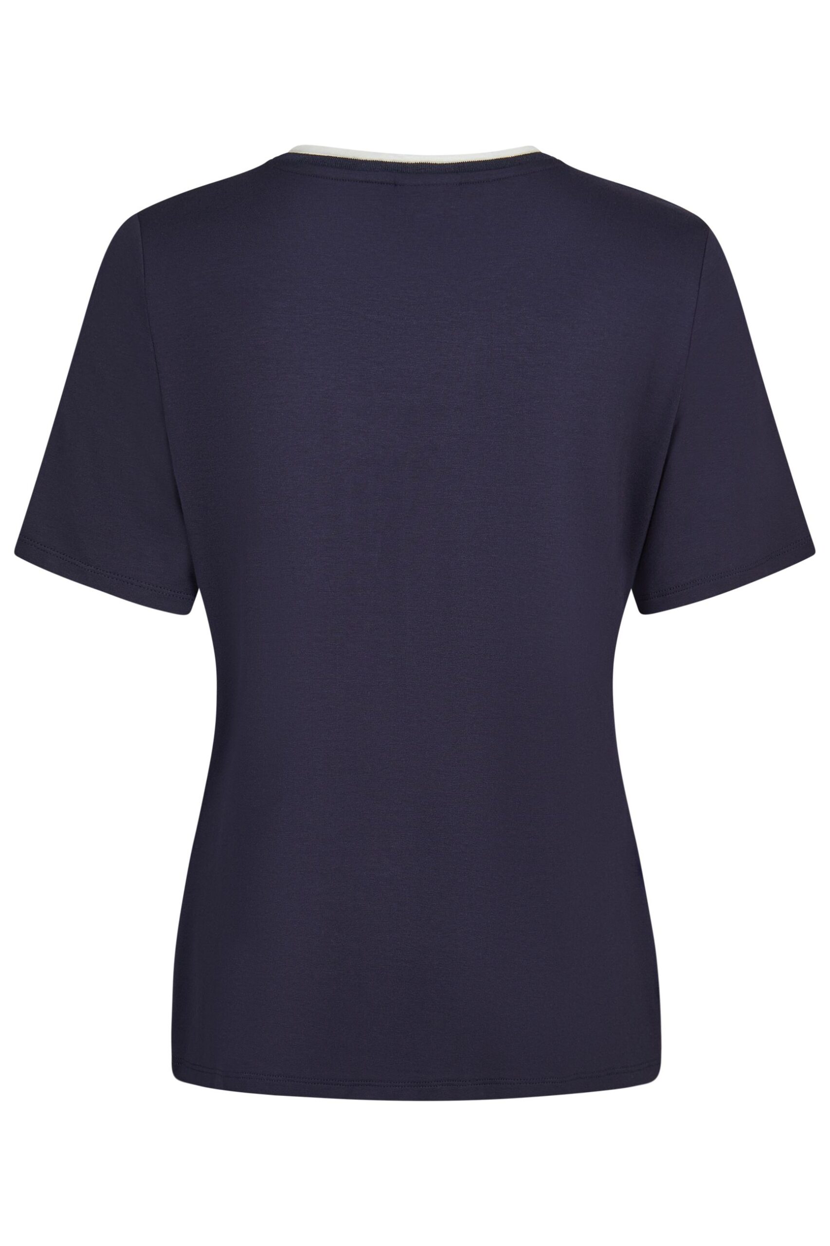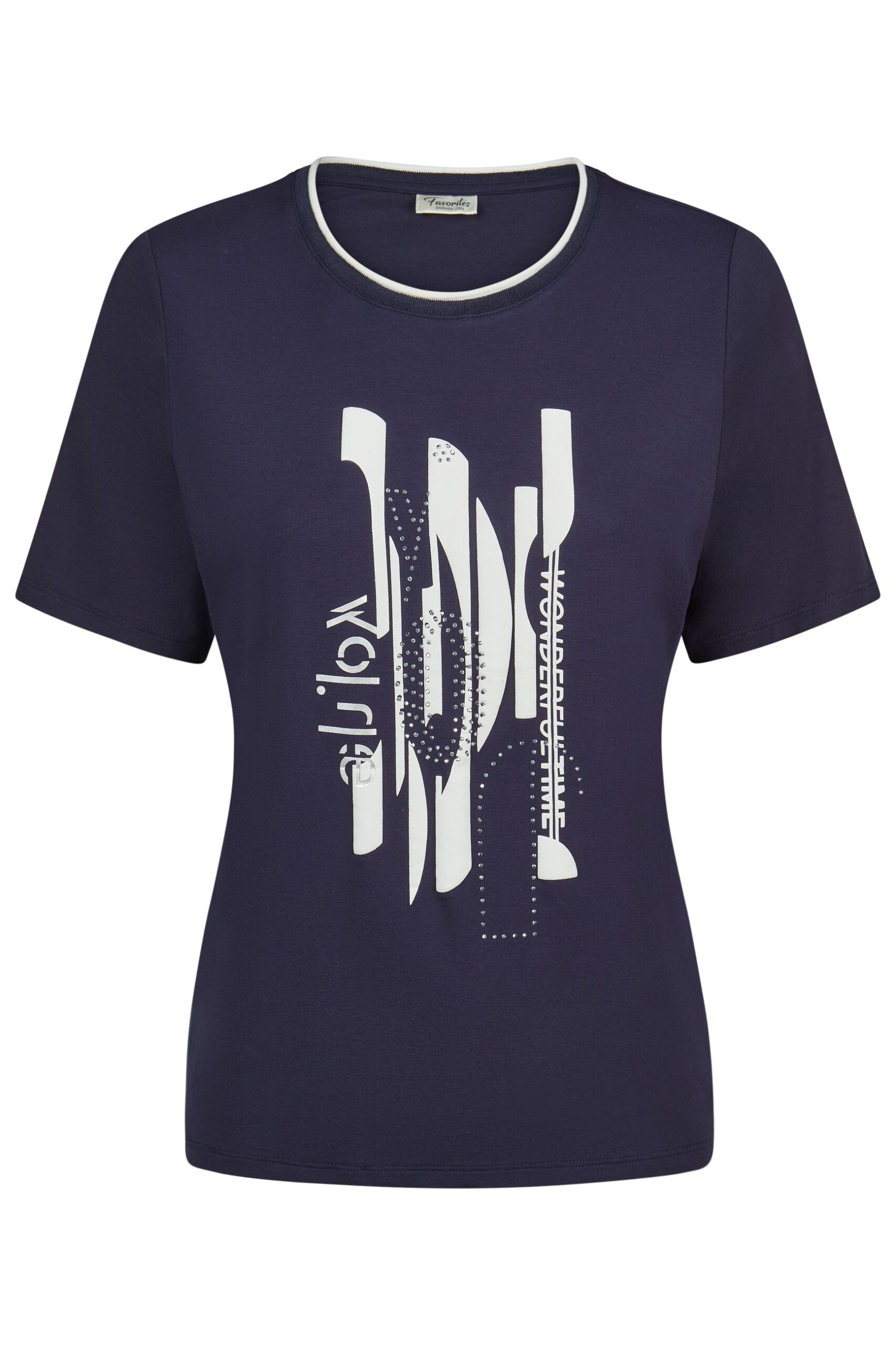 T-shirt da donna Lebek dal design moderno e raffinato, realizzata in morbida viscosa elasticizzata che garantisce comfort e vestibilità impeccabile. Il modello presenta girocollo con elegante profilo a contrasto e manica corta. La stampa grafica frontale nei toni del bianco e argento, arricchita da applicazioni luminose, dona un tocco contemporaneo e femminile, ideale per valorizzare anche i look più semplici.