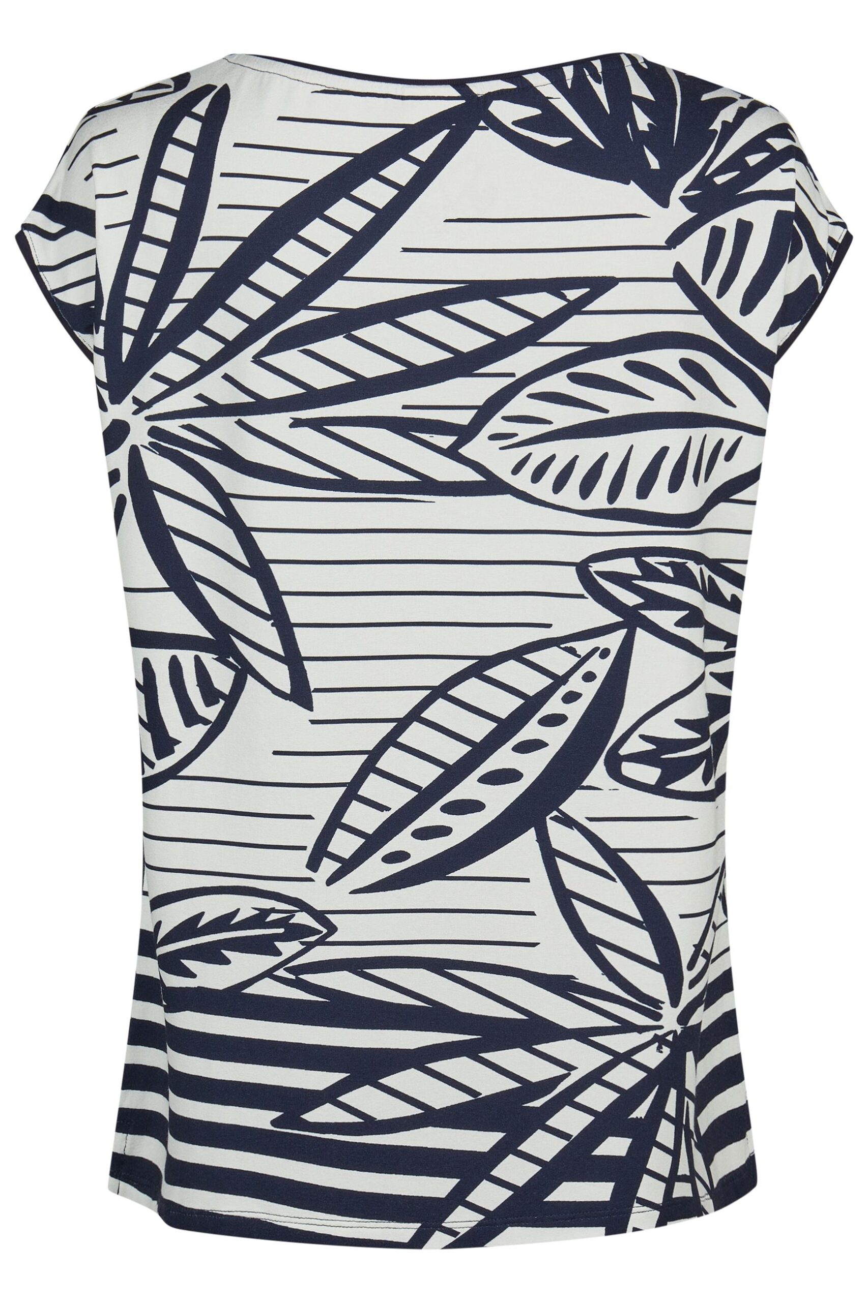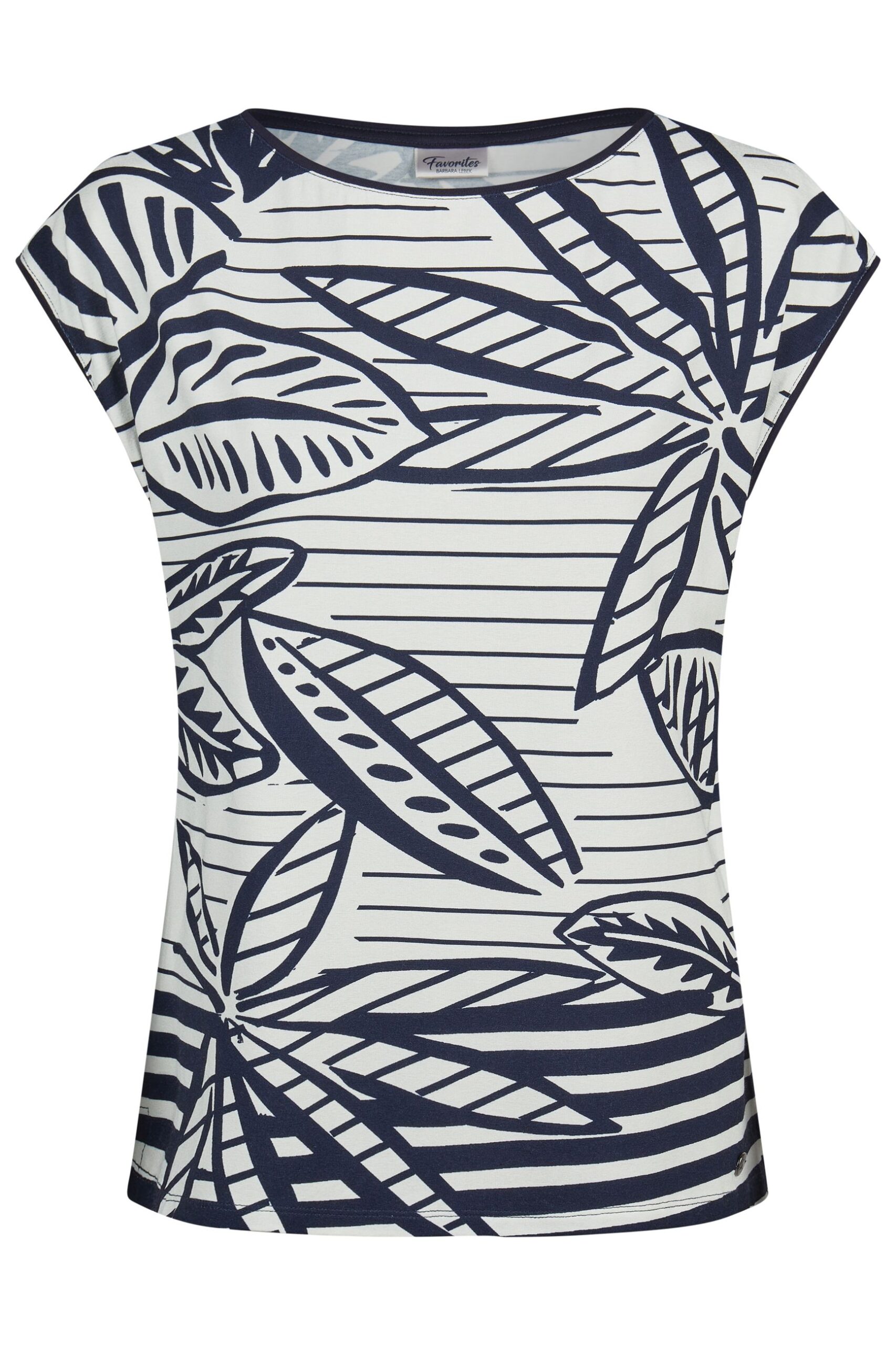 T-shirt da donna Barbara Lebek dal gusto fresco e contemporaneo, caratterizzata da una raffinata fantasia grafica ispirata alle foglie nei classici toni bianco e blu. Il modello presenta manica scesa che dona una vestibilità morbida e confortevole, ideale per valorizzare la silhouette senza costringere.