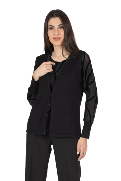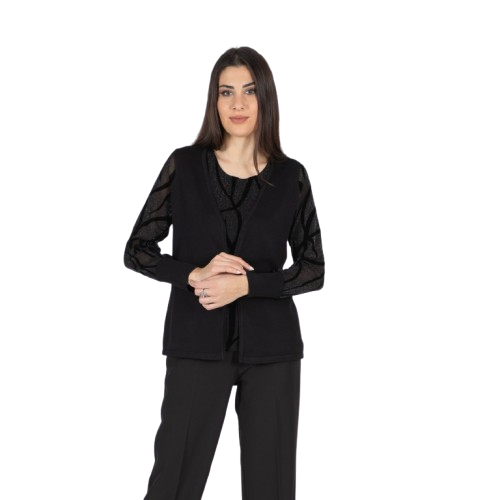 Twin set elegante che unisce sofisticatezza e stile: la canotta in tessuto trasparente lurex con raffinati giochi di floccatura si abbina perfettamente al cardigan in morbida maglia, arricchito da maniche in tessuto . Un mix di texture e dettagli preziosi che dona un look unico e raffinato. Aggiungi subito questo must-have al tuo guardaroba per brillare in ogni occasione! 70% viscosa 20% lana 10% elastan