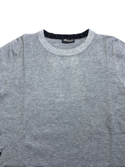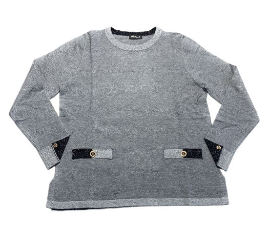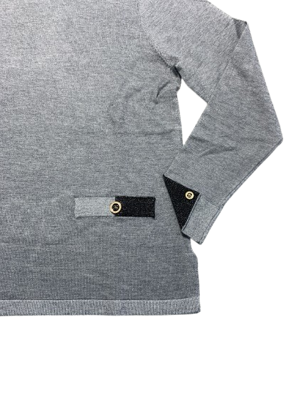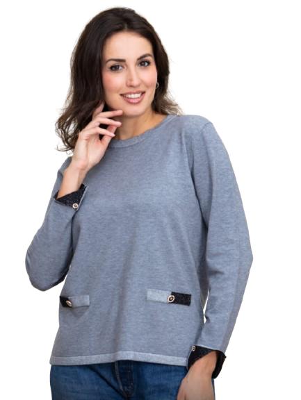 Maglia donna in maglina di viscosa linea confort con profili in lurex sia nello stesso tono che a contrasto finte tasche laterali e applicazioni di bottoni sulle tasche e sulle maniche