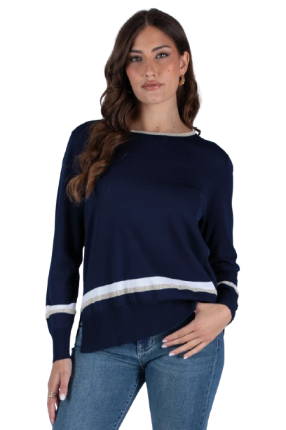 Il design minimal ed elegante è arricchito da raffinati inserti in lurex che impreziosiscono il capo lungo il bordo dello scollo, sulle maniche e sul fondo. Questi dettagli luminosi donano un tocco di brillantezza discreta, rendendo la maglia ideale anche per occasioni più eleganti.