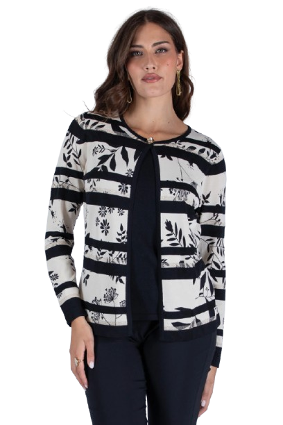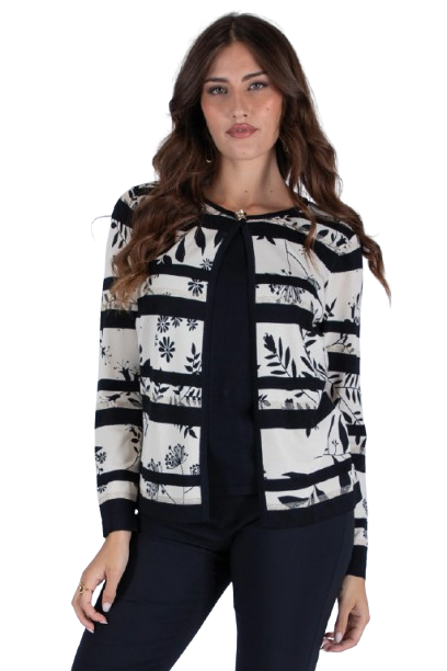 Il capo è impreziosito da una raffinata stampa floreale combinata con motivi a righe orizzontali, che donano dinamismo e originalità al design. Il contrasto cromatico crea un effetto elegante e moderno, perfetto per outfit sia da giorno che da ufficio.