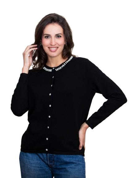 Giacca donna in maglina di viscosa con doppia collana di perle intorno allo scollo rotondo aperta con bottoni metallici con strass linea confort