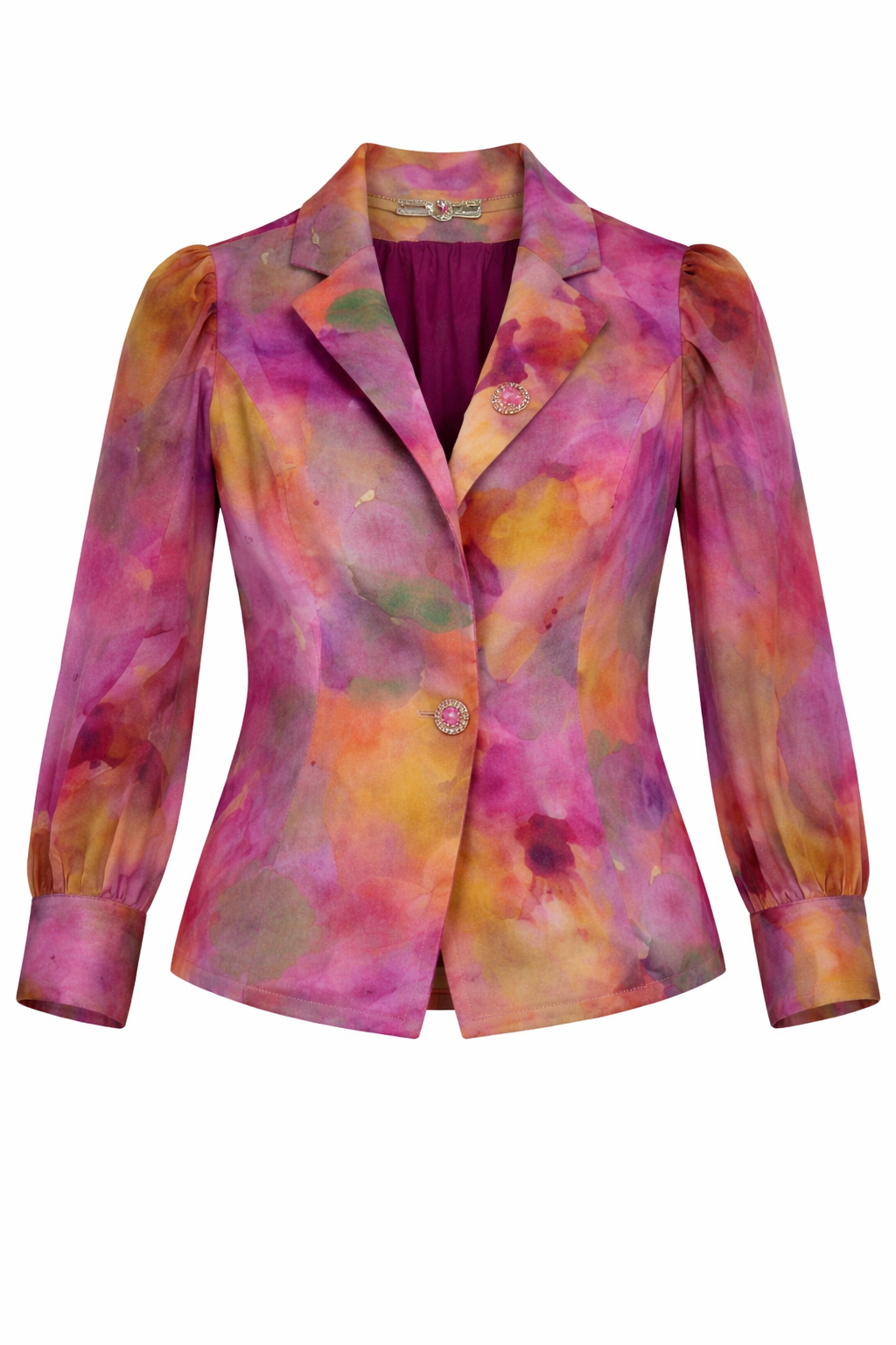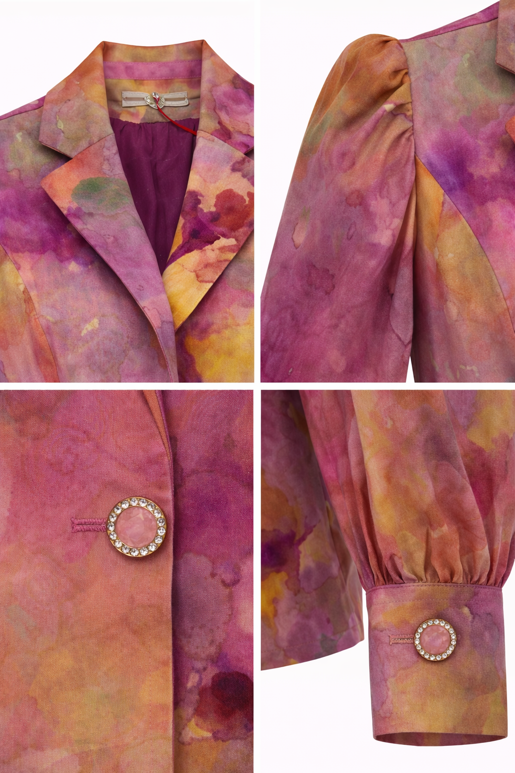 La stampa effetto acquerello, con un mix armonioso di colori vivaci come rosa, fucsia, arancio e verde, rende ogni giacca unica e di grande impatto visivo. Il design è arricchito da un rever classico che dona struttura e raffinatezza al capo.