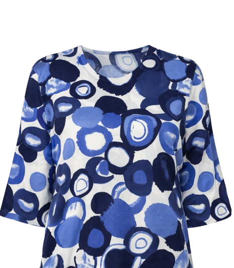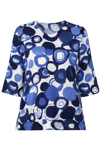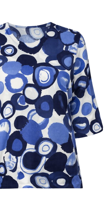 Maglia da donna elegante e moderna realizzata in filo di viscosa leggero e morbido, caratterizzata da una raffinata fantasia madreperla che dona movimento e luminosità al capo. Il design presenta un gioco di forme astratte nei toni del blu e dell’azzurro su fondo chiaro, creando un effetto grafico contemporaneo e distintivo.