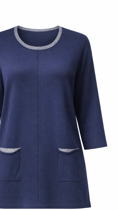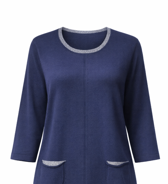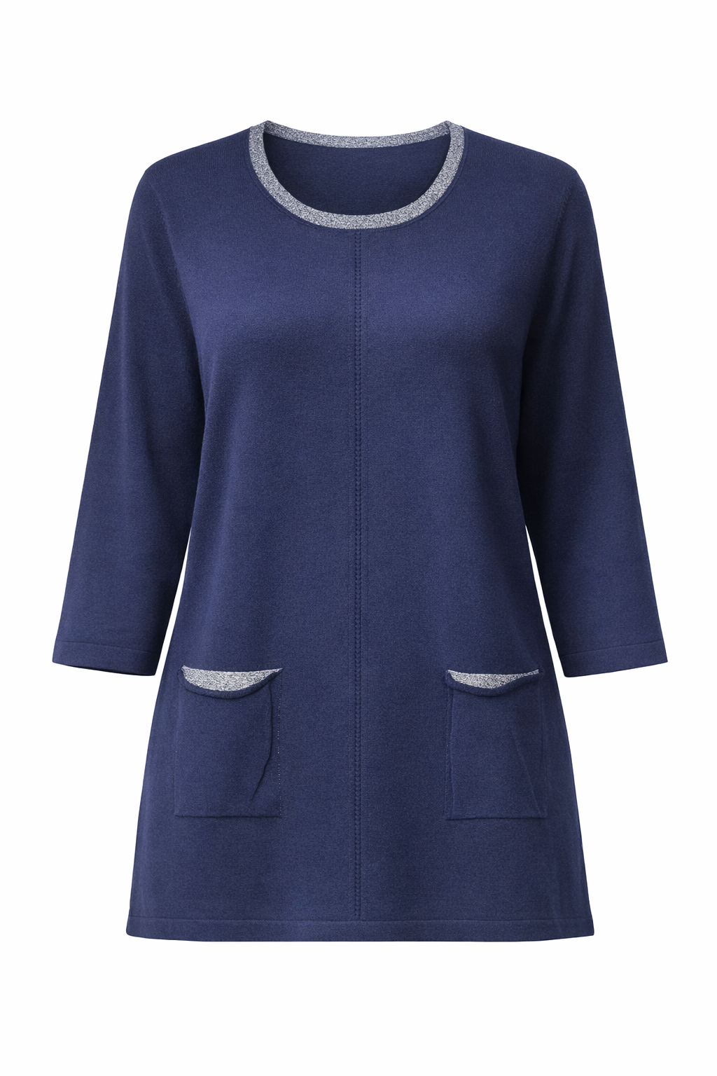 Il modello presenta maniche 3/4, ideali per la mezza stagione e per un look raffinato ma pratico. Il girocollo è impreziosito da un elegante profilo in lurex, che dona un delicato punto luce al capo.