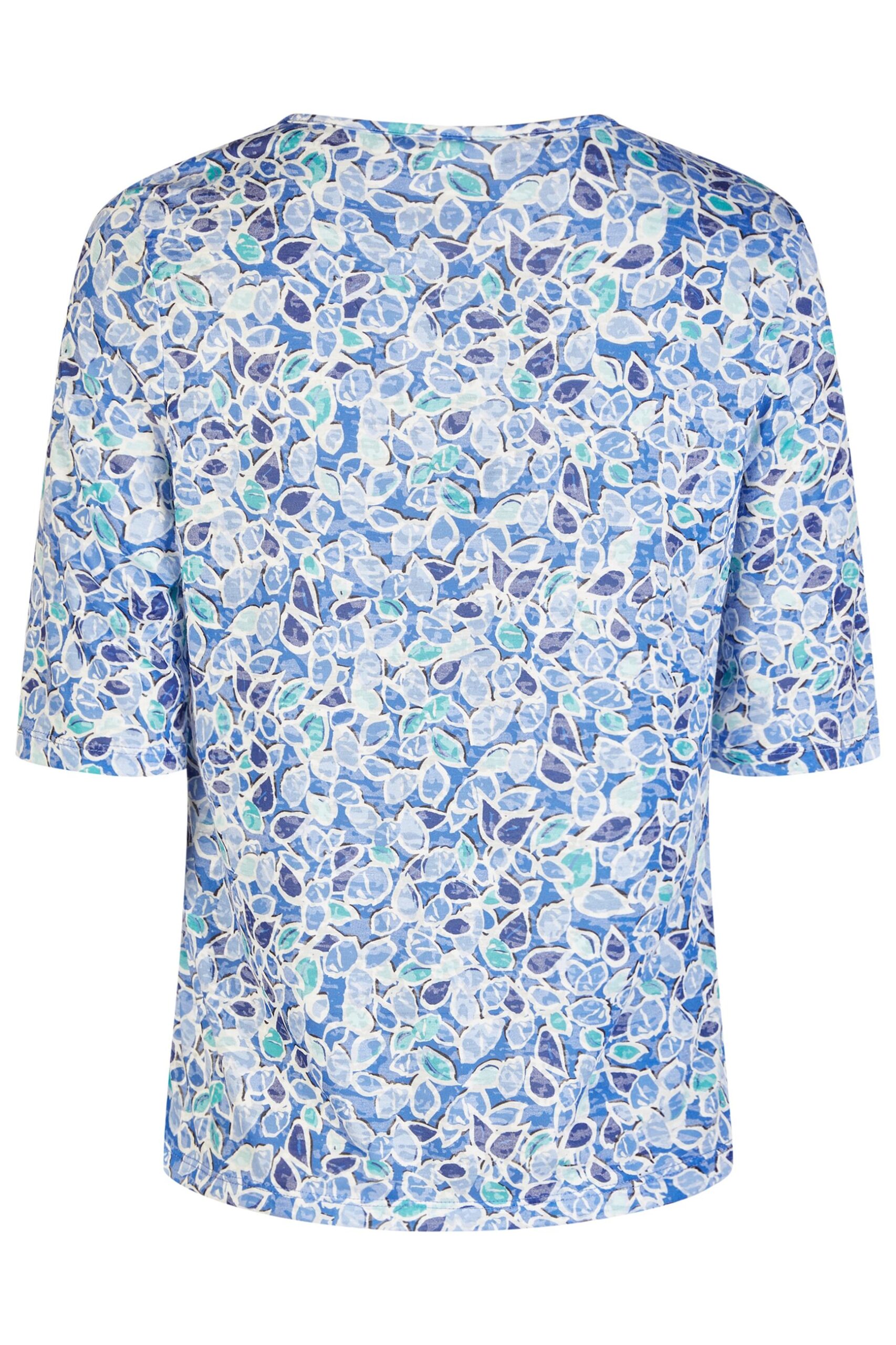 Fantasia floreale all-over: raffinato motivo nei toni del blu, azzurro e bianco per un effetto fresco e luminoso