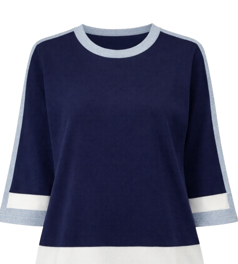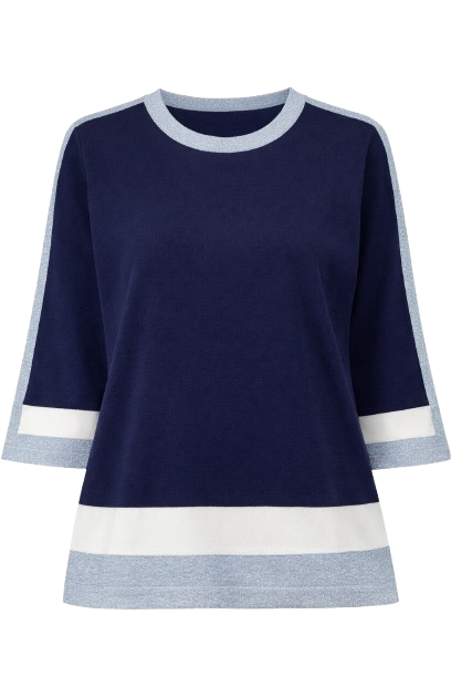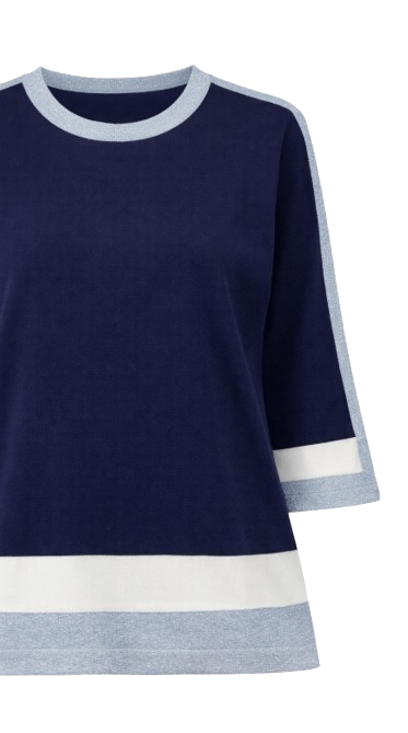 Il modello presenta un girocollo classico impreziosito da un profilo celeste in lurex, che aggiunge un elegante punto luce al design. Le maniche 3/4 garantiscono comfort e praticità , rendendo questa maglia ideale per la mezza stagione o per essere abbinata sotto giacche e cardigan.