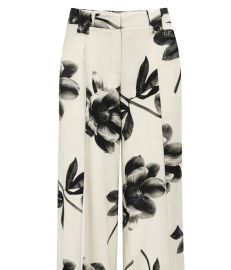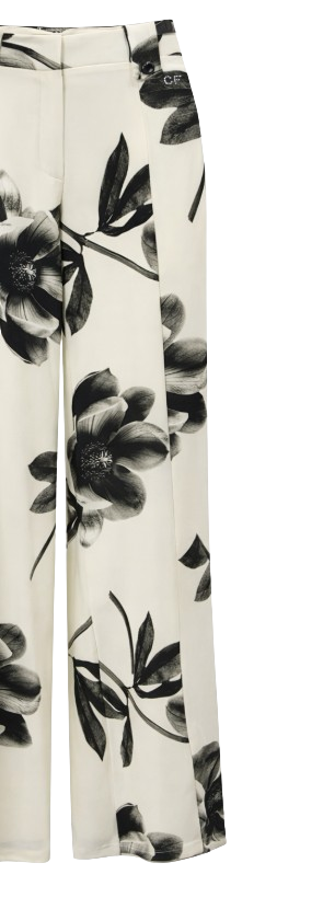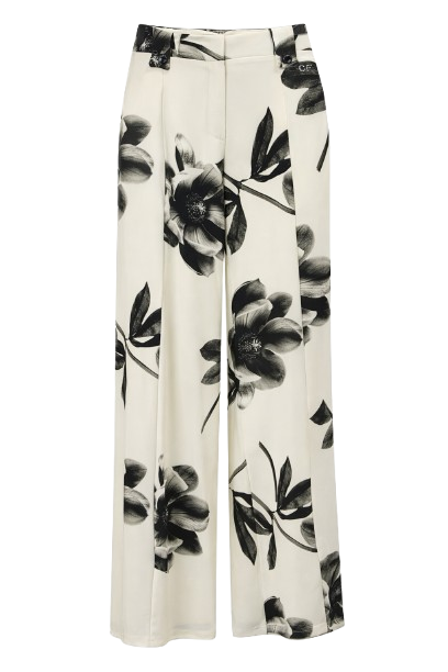 Il tessuto color panna con stampa floreale nera dona al pantalone un look sofisticato e moderno, perfetto per outfit eleganti o casual chic. La stampa floreale di grande impatto crea un effetto raffinato che rende questo capo protagonista del guardaroba.