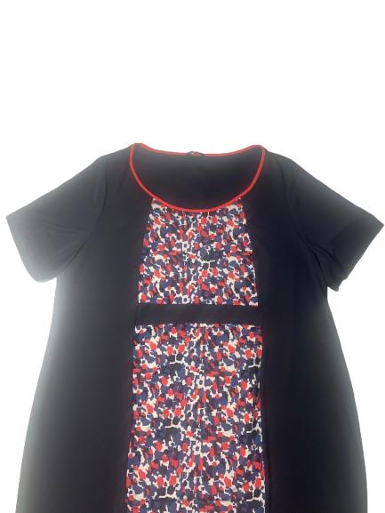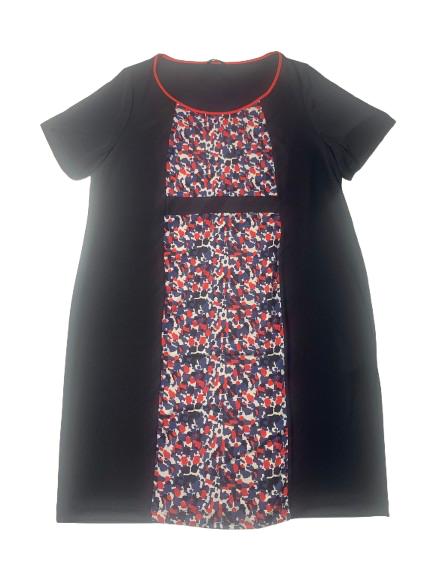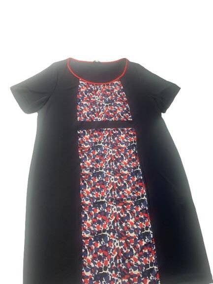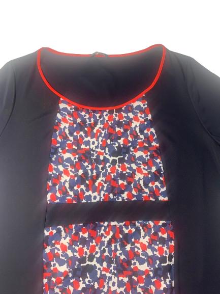 Abito donna Luisa Viola in viscosa mezza manica scollo ampio con profilo a contrasto e stampa sulla fascia centrale anteriore sui toni del panna rosso avion su fondo blu