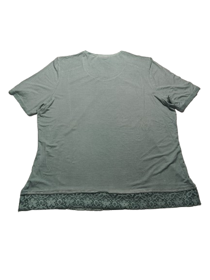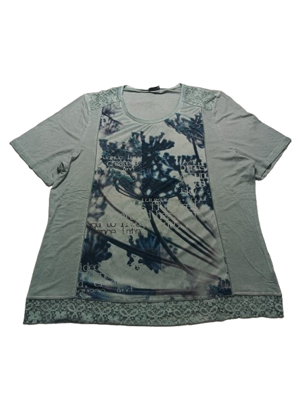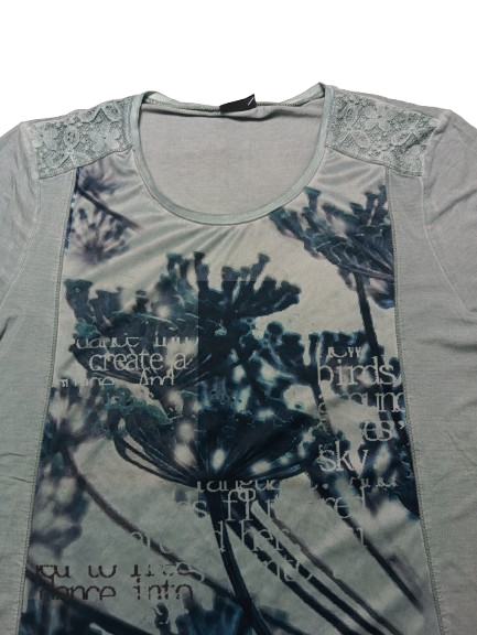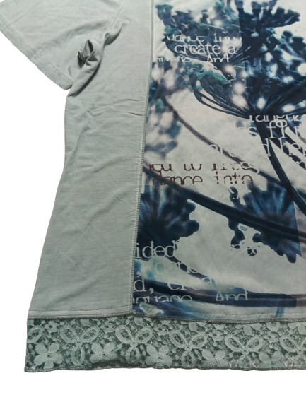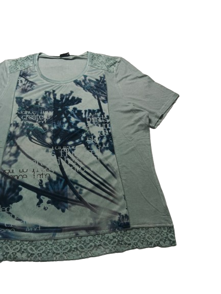T-shirt donna Barbara Lebek in viscosa delavè mezza manica con stampa anteriore e applicazione di pizzo sulle spalle e sul fondo tinta su tinta