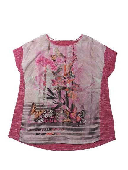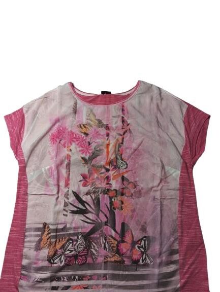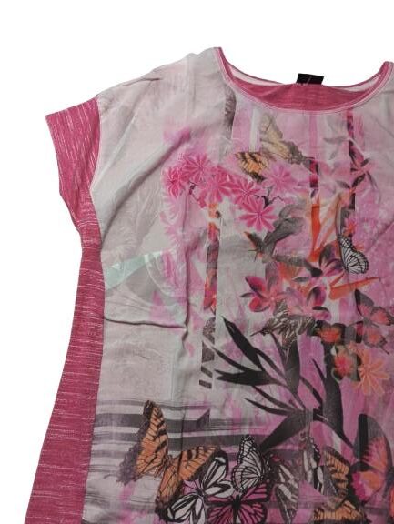 Blusa donna Barbara Lebek in viscosa e poliestere con pannello camicia anteriore e posteriore in maglina melange manica scesa collo a barca leggermente piu lunga dietro