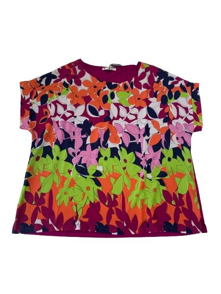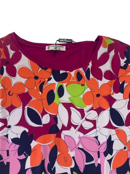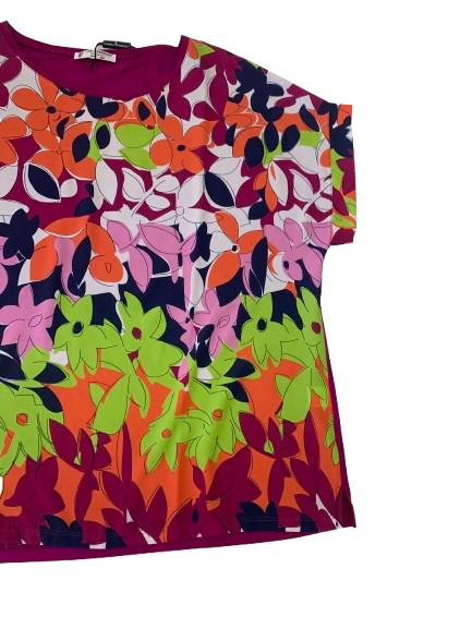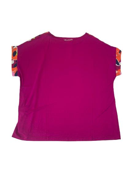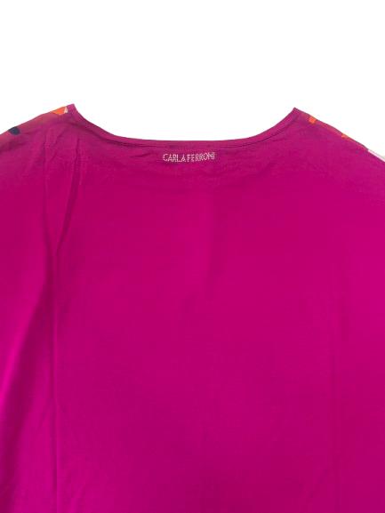 Blusa donna Carla Ferroni in viscosa con stampa anteriore su tessuto e maglina di viscosa tinta unita posteriore con marchio brillantinato stampa floreale anteriore con manica scesa