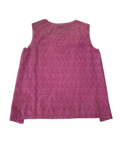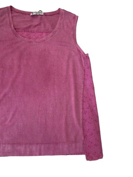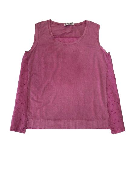 Canotta donna Carla Ferroni in viscosa in tessuto delavè con fasce laterali e pannello posteriore in effetto pizzo sangallo traforato e parte anteriore liscia con marchio in strass sul collo