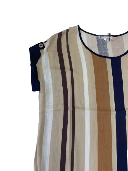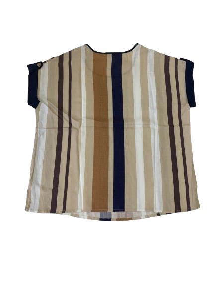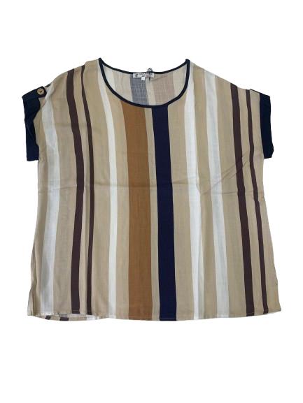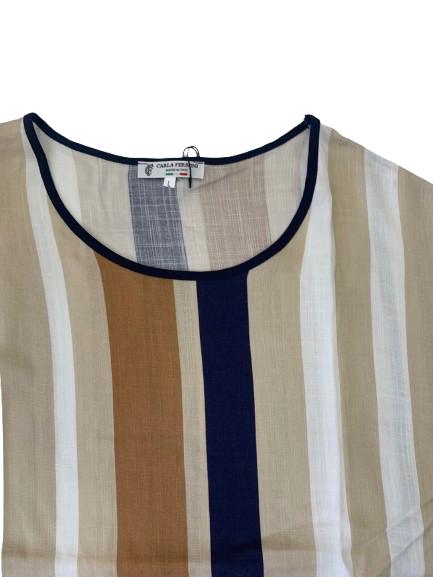 Blusa donna Carla Ferroni in lino e viscosa con manica raglan scesa profilo in blu con bottone su fantasia a righe sui toni del beige