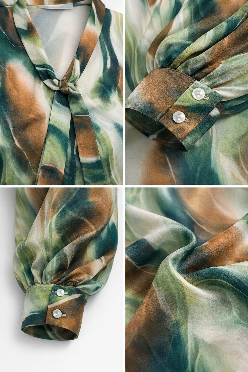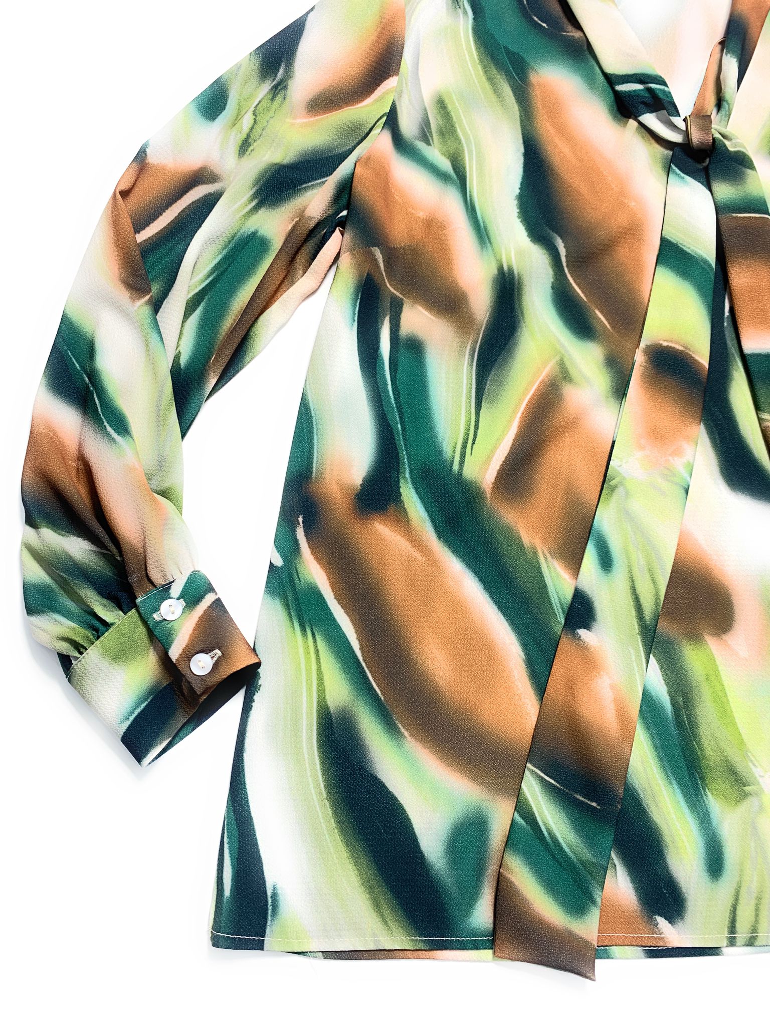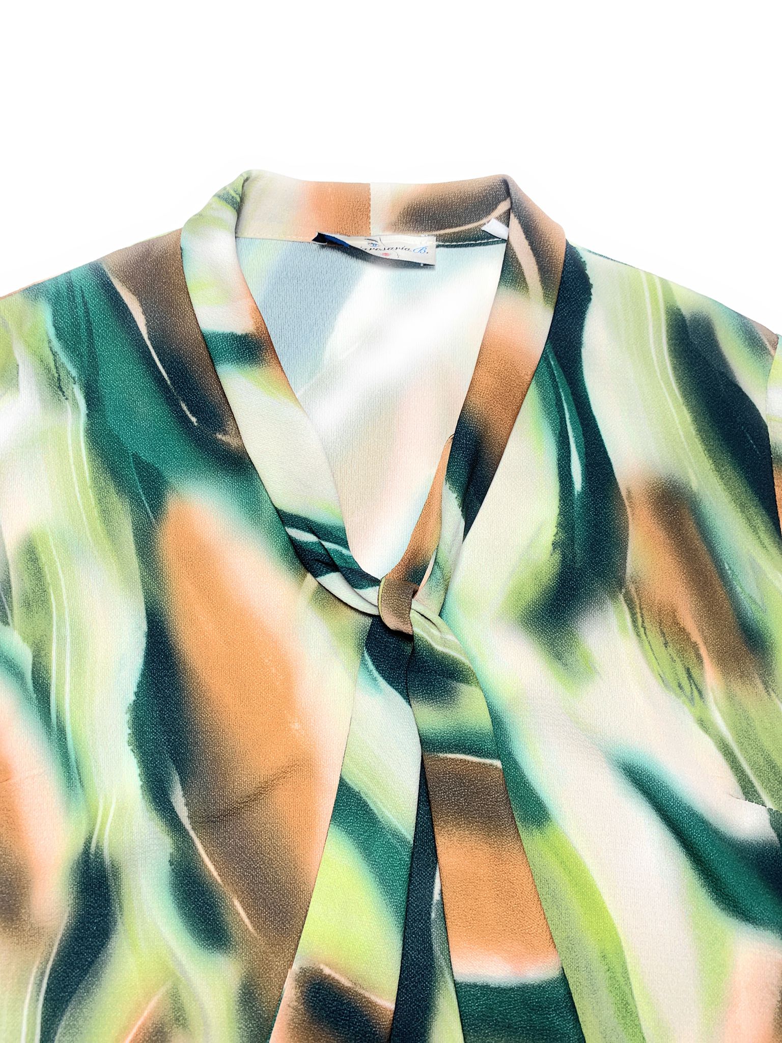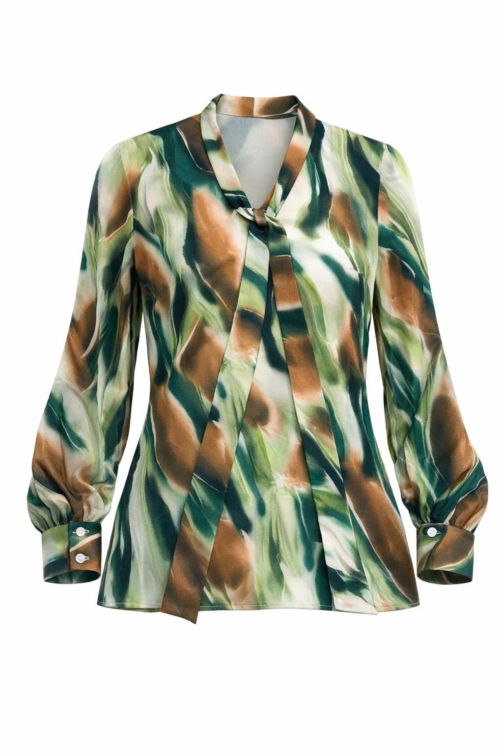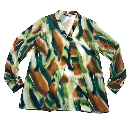 Casacca donna Mariarosaria B. collo con sciarpetta manica lunga fantasia astratta sui toni del verde in viscosa con polsino alle maniche leggermente arricciate