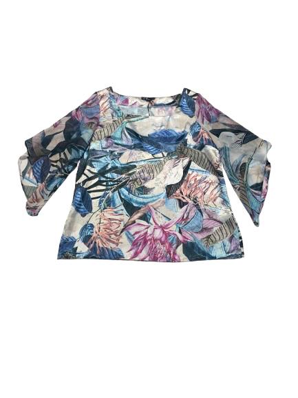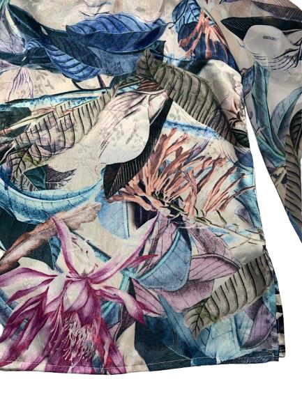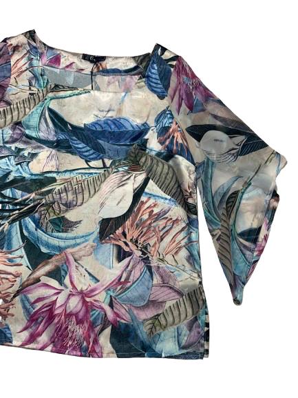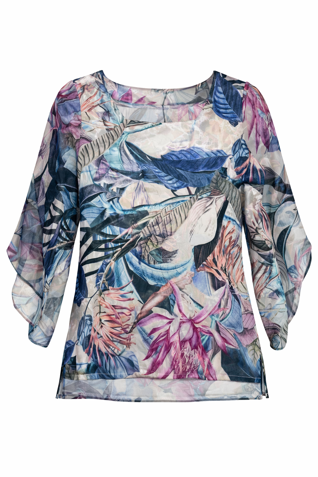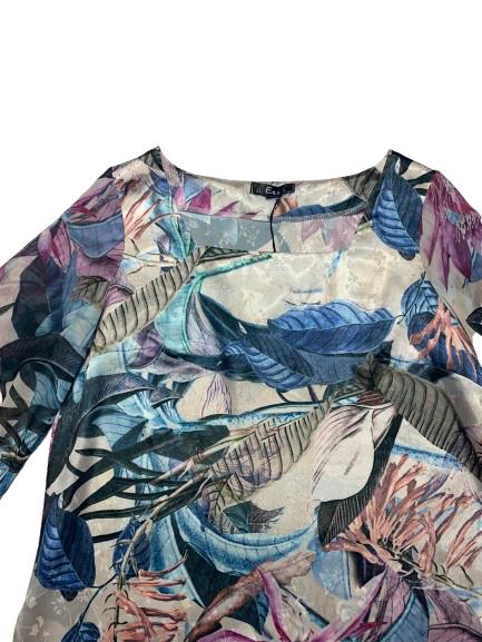 Blusa donna Mariarosaria B. dalla linea dritta in raso lucido fantasia con manica 3/4 asimmetrica scollo ampio rettangolare e spacchetti laterali sul fondo