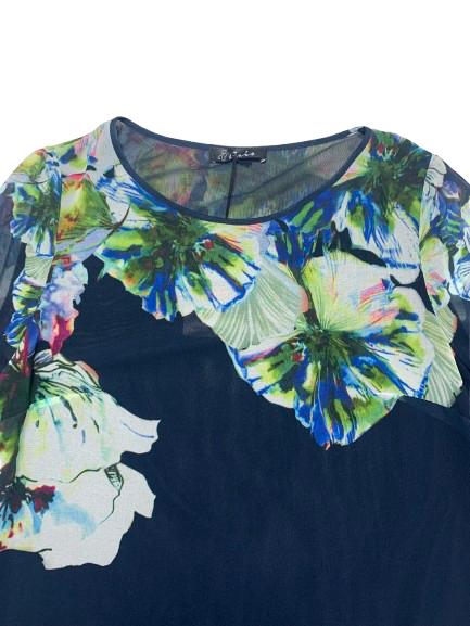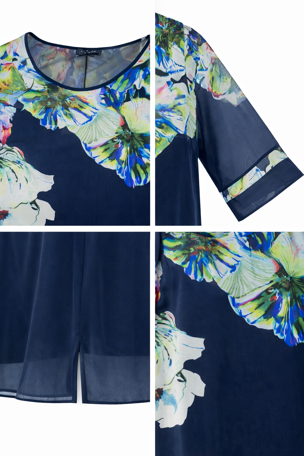 Stampa floreale posizionata: decoro sul décolleté effetto snellente