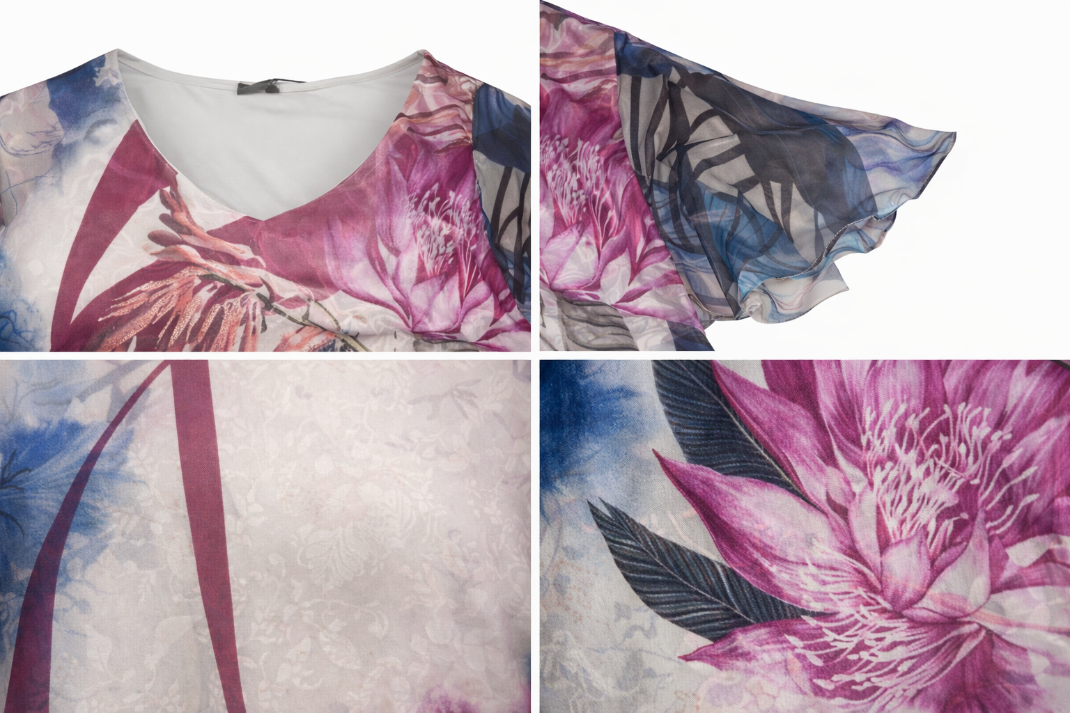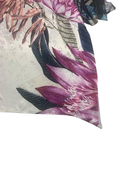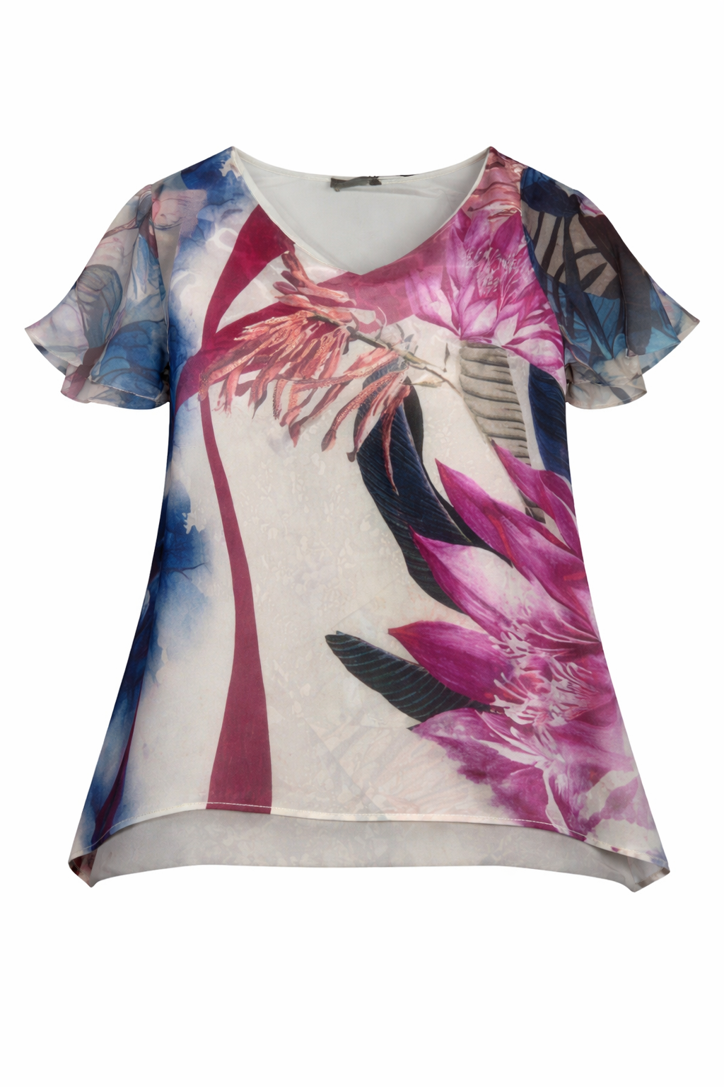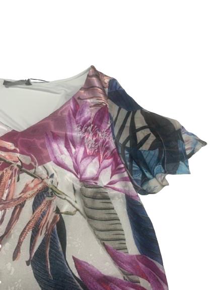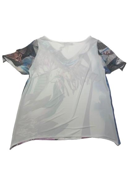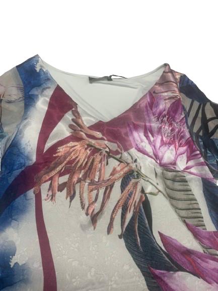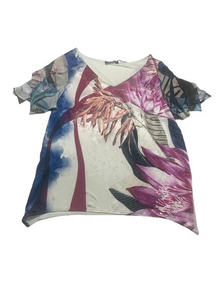 Blusa donna Mariarosaria B. mezza manica asimmetrica in georgette fantasia pannello anteriore in raso fantasia con applicazione di strass e retro tinta unita in maglina modello scollo a V leggermente asimmetrica lateralmente sul fondo