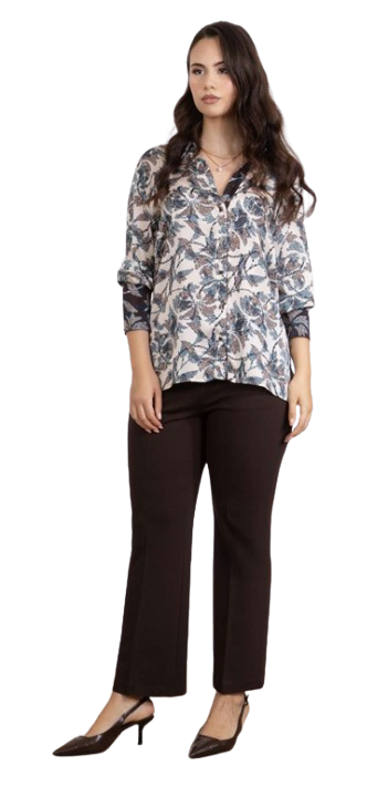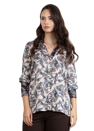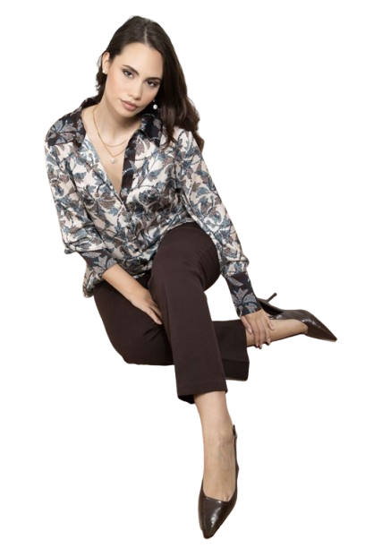 Camicia donna in raso con fantasia su fondo chiaro e intarsi blu e moro linea curvy taglio dritto tessuto lucido chiusura con bottoni