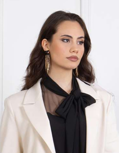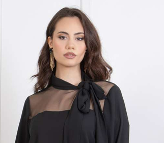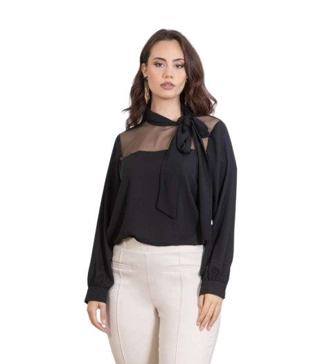 Blusa donna in crepe manica lunga con collo a pistagna con fiocco laterale linea curvy trasparenza sul decoltè