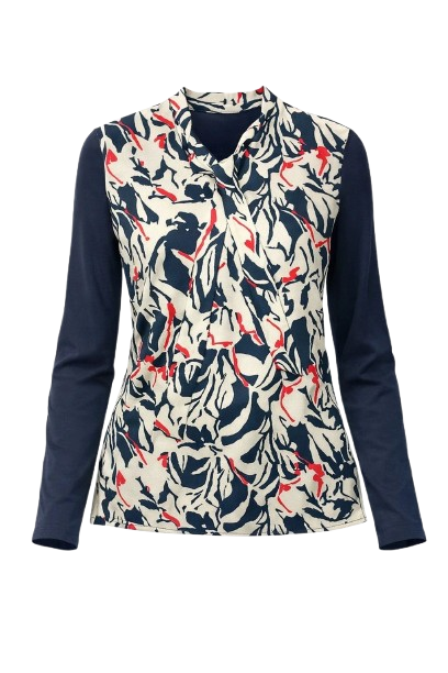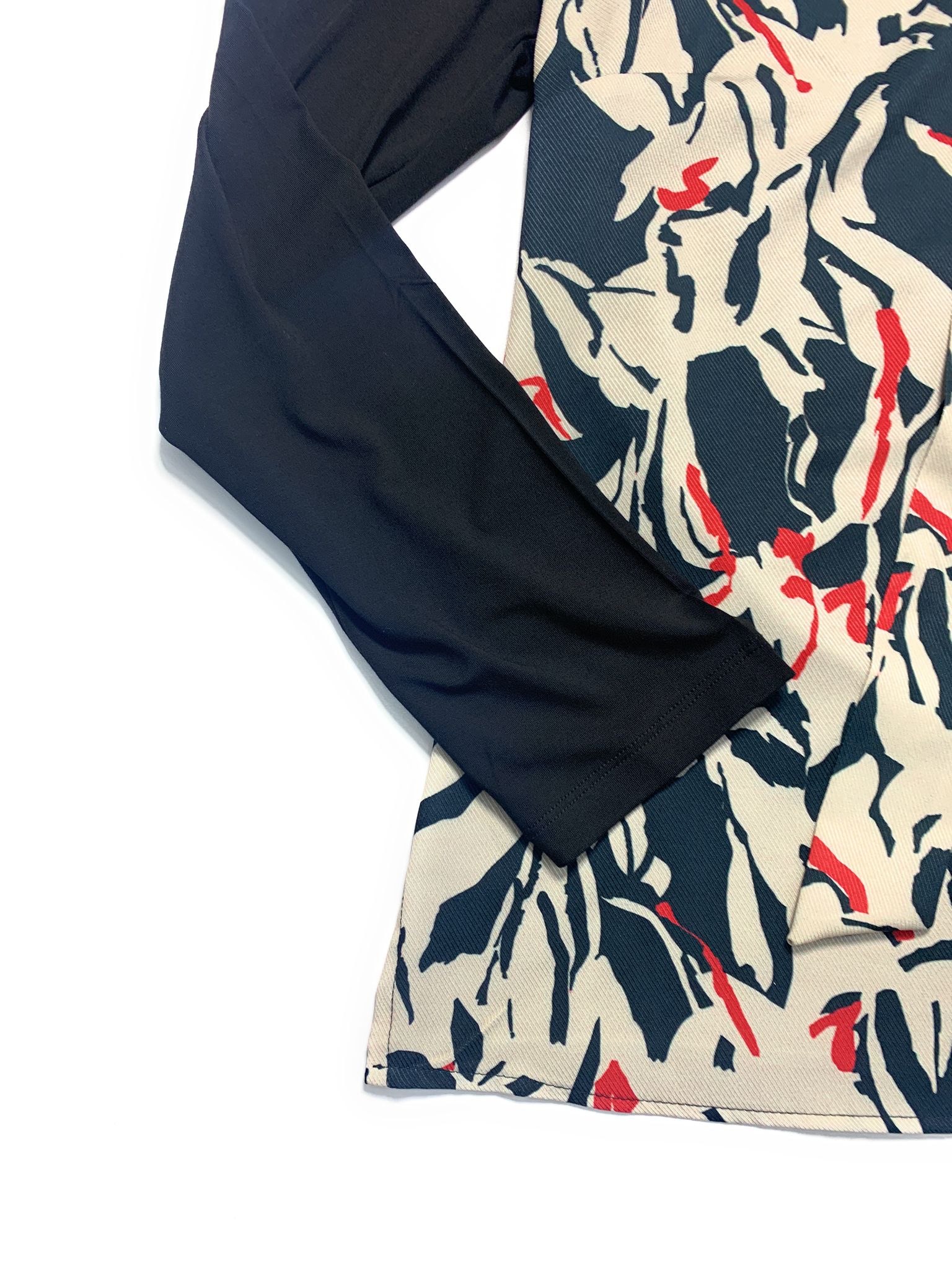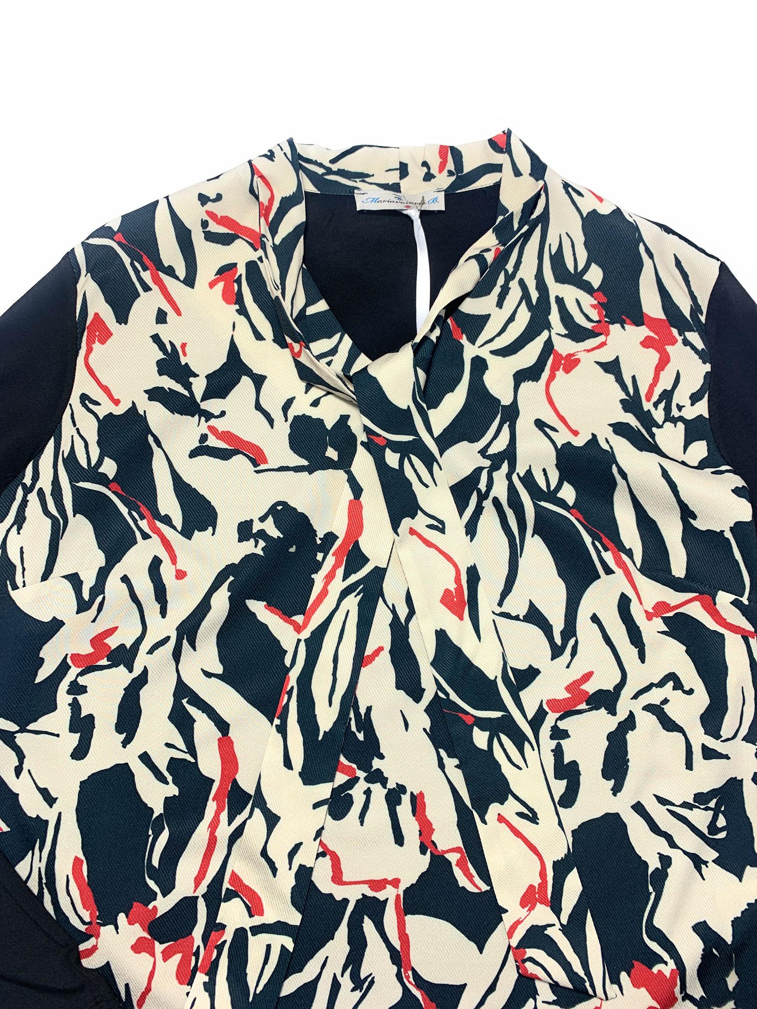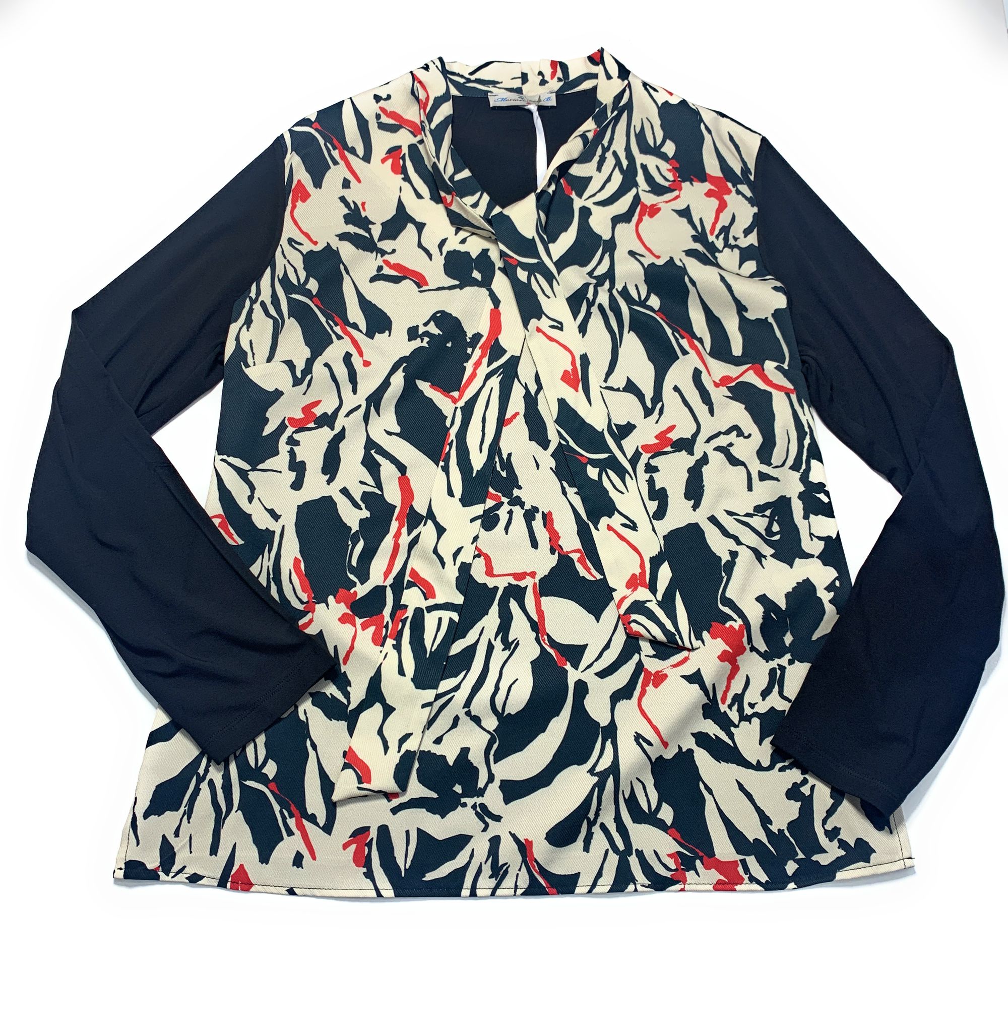 Casacca donna Mariarosaria B. in tessuto fantasia anteriore e maglina di viscosa posteriore manica lunga completa una fiocco il collo a V della casacca
