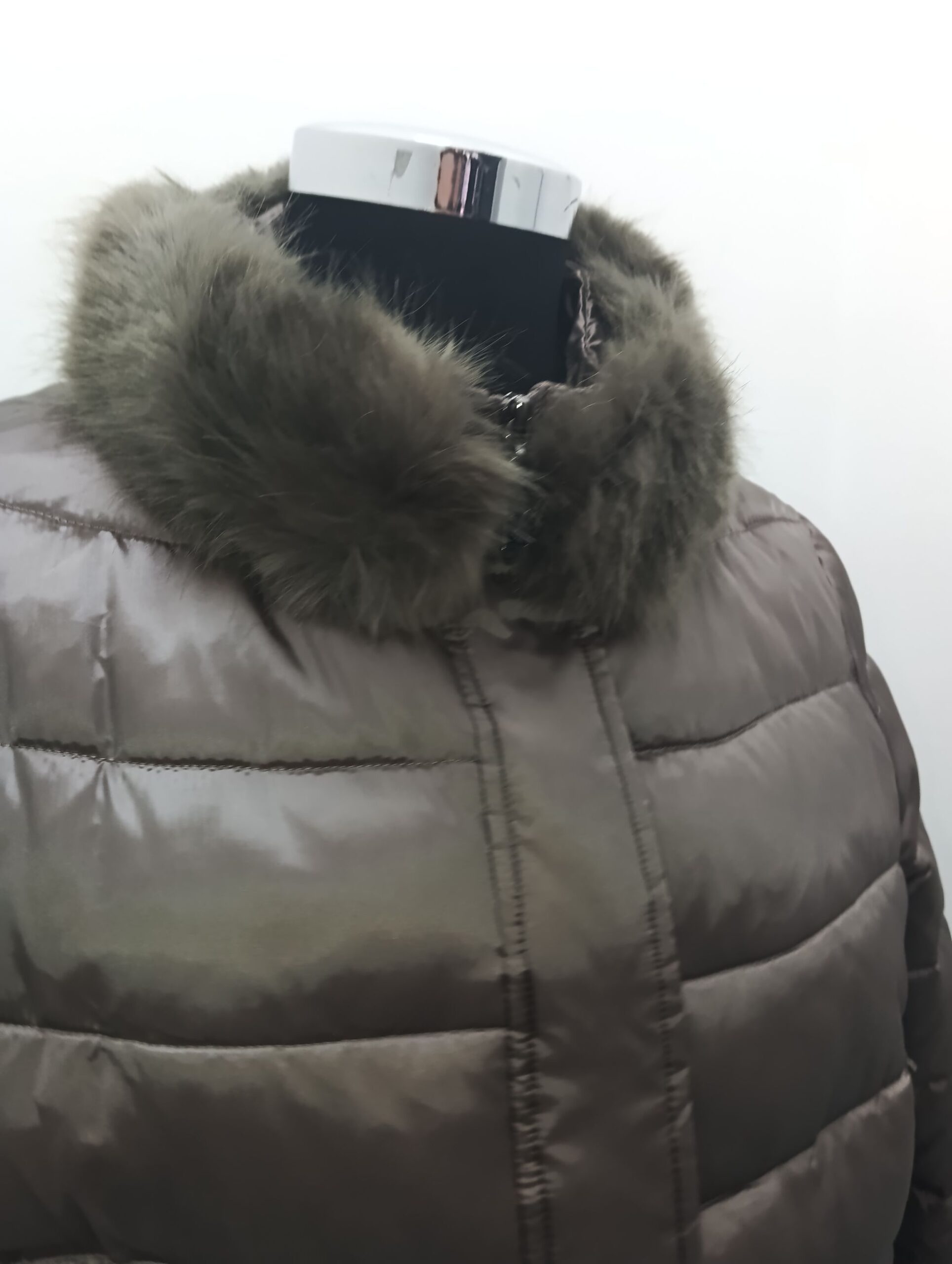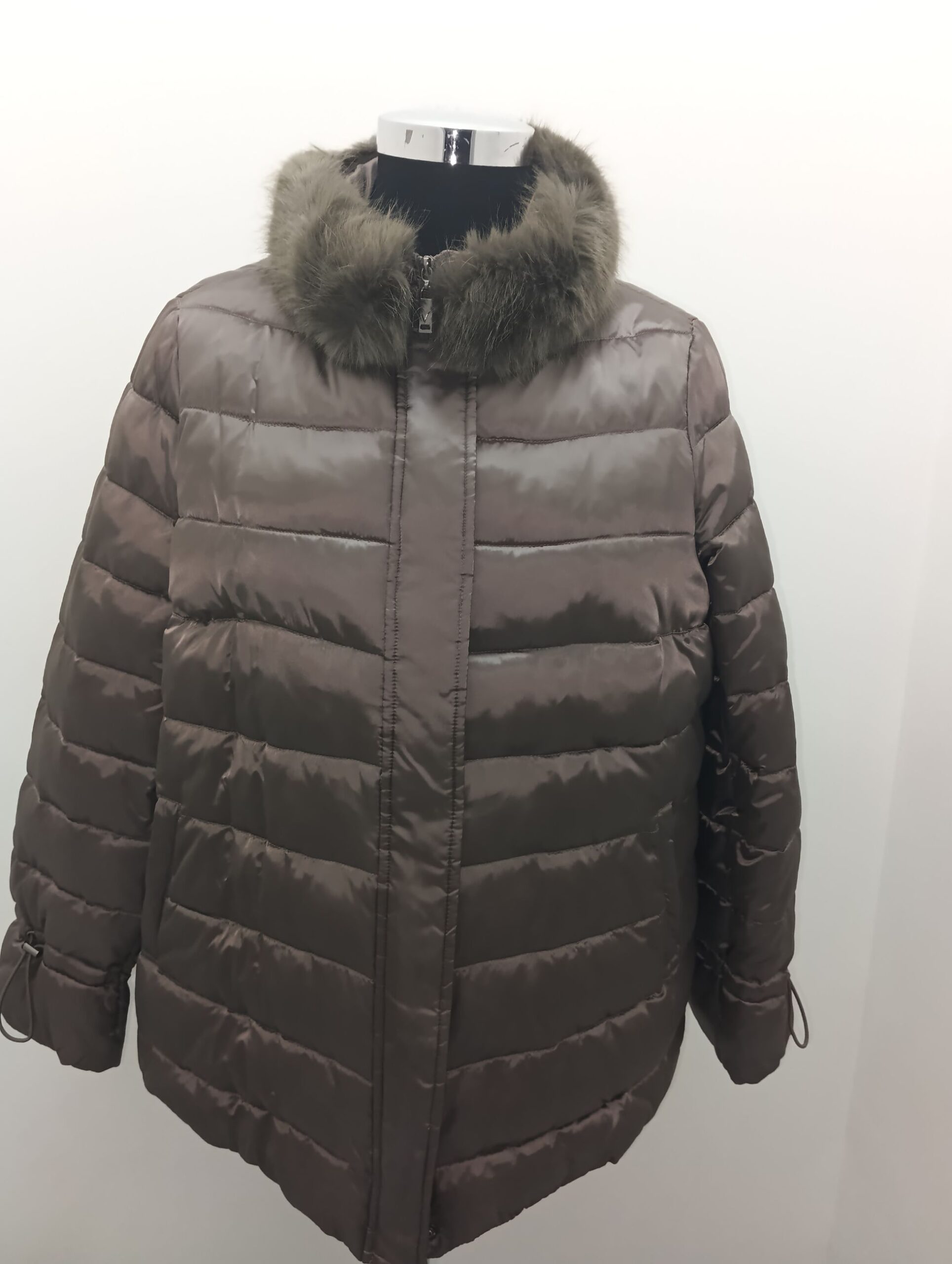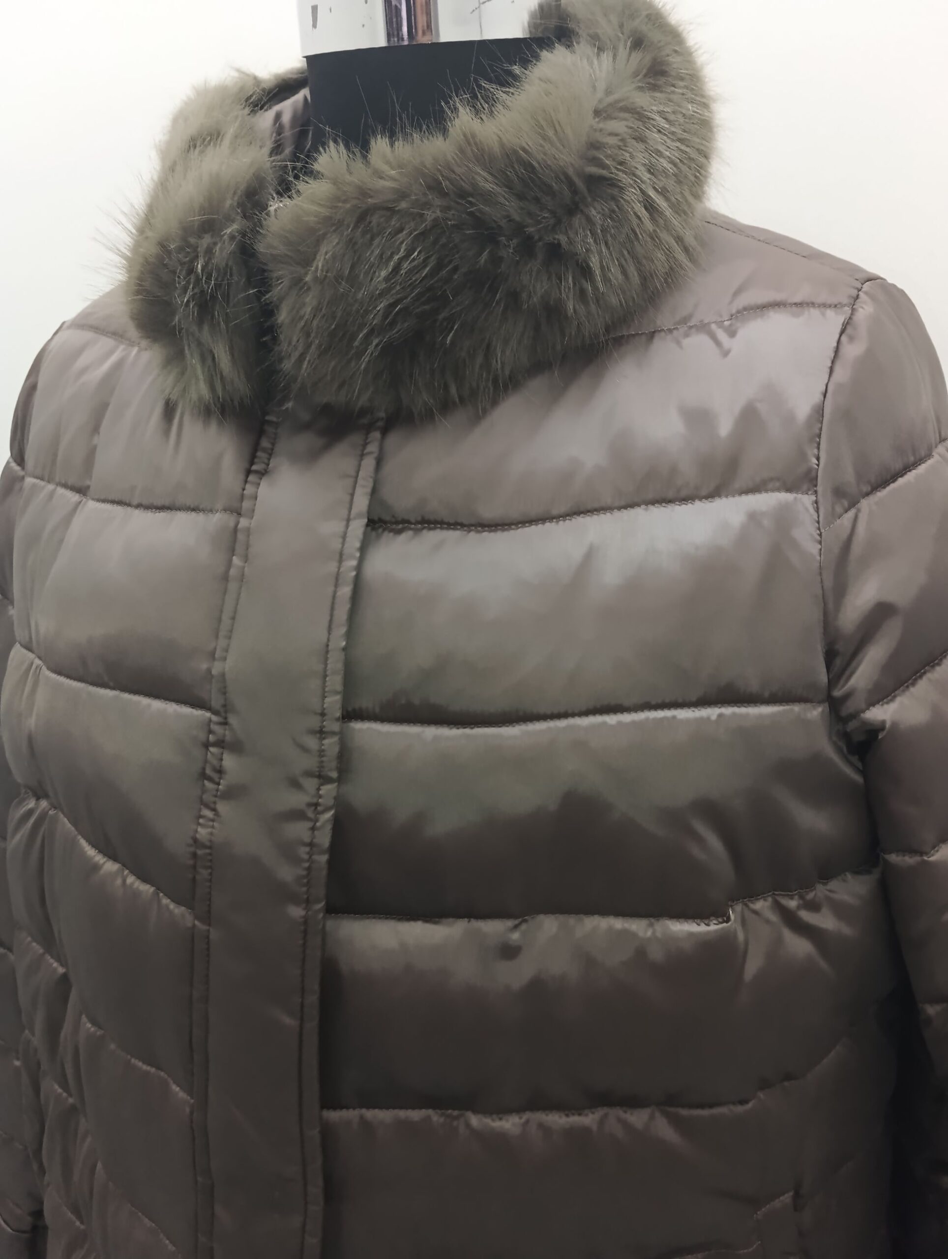 Piumino donna polsino antivento eco-pelliccia staccabille sul collo chiusura cerniera e bottoni tessuto lucido manica a sacchetto
