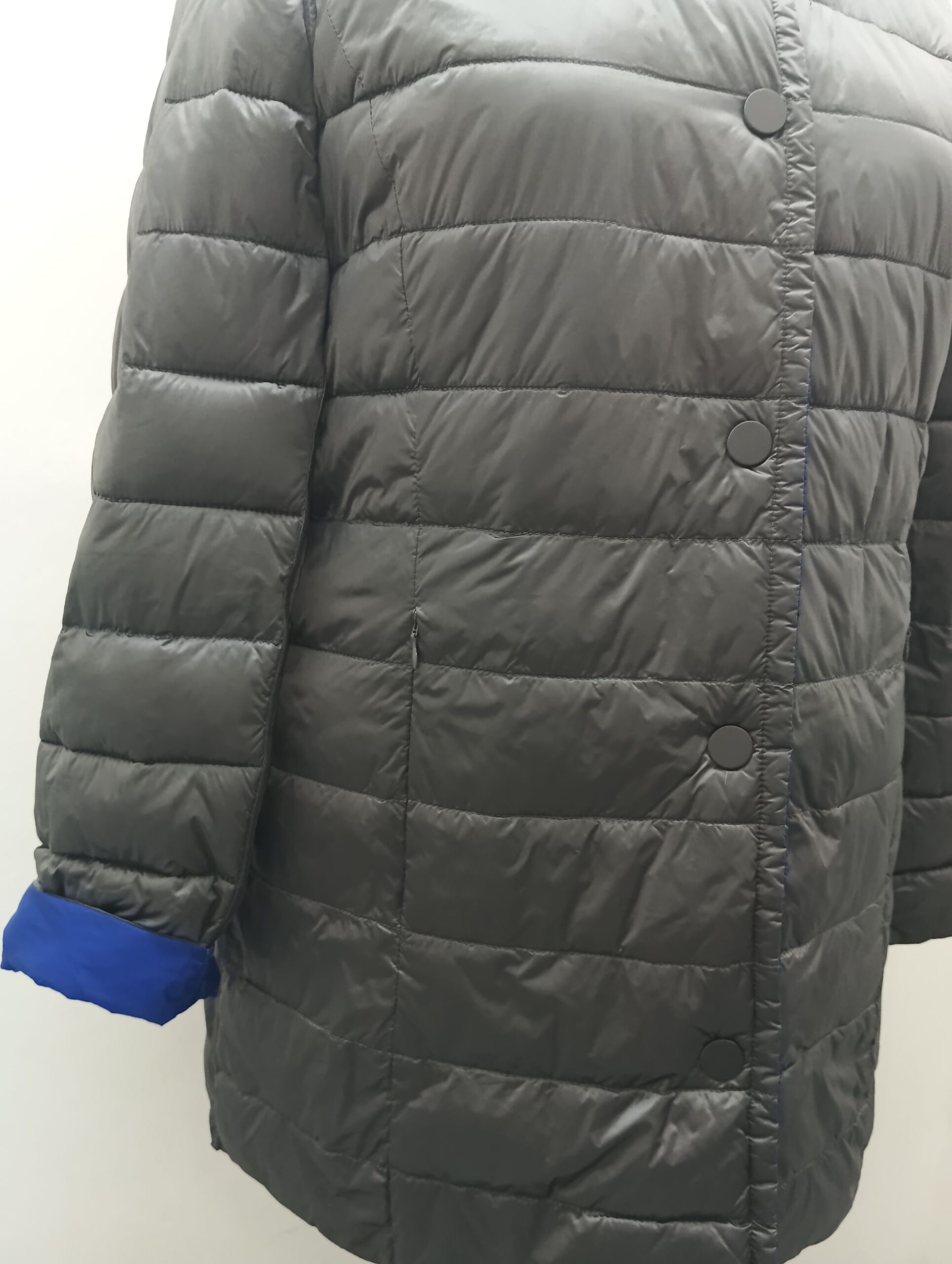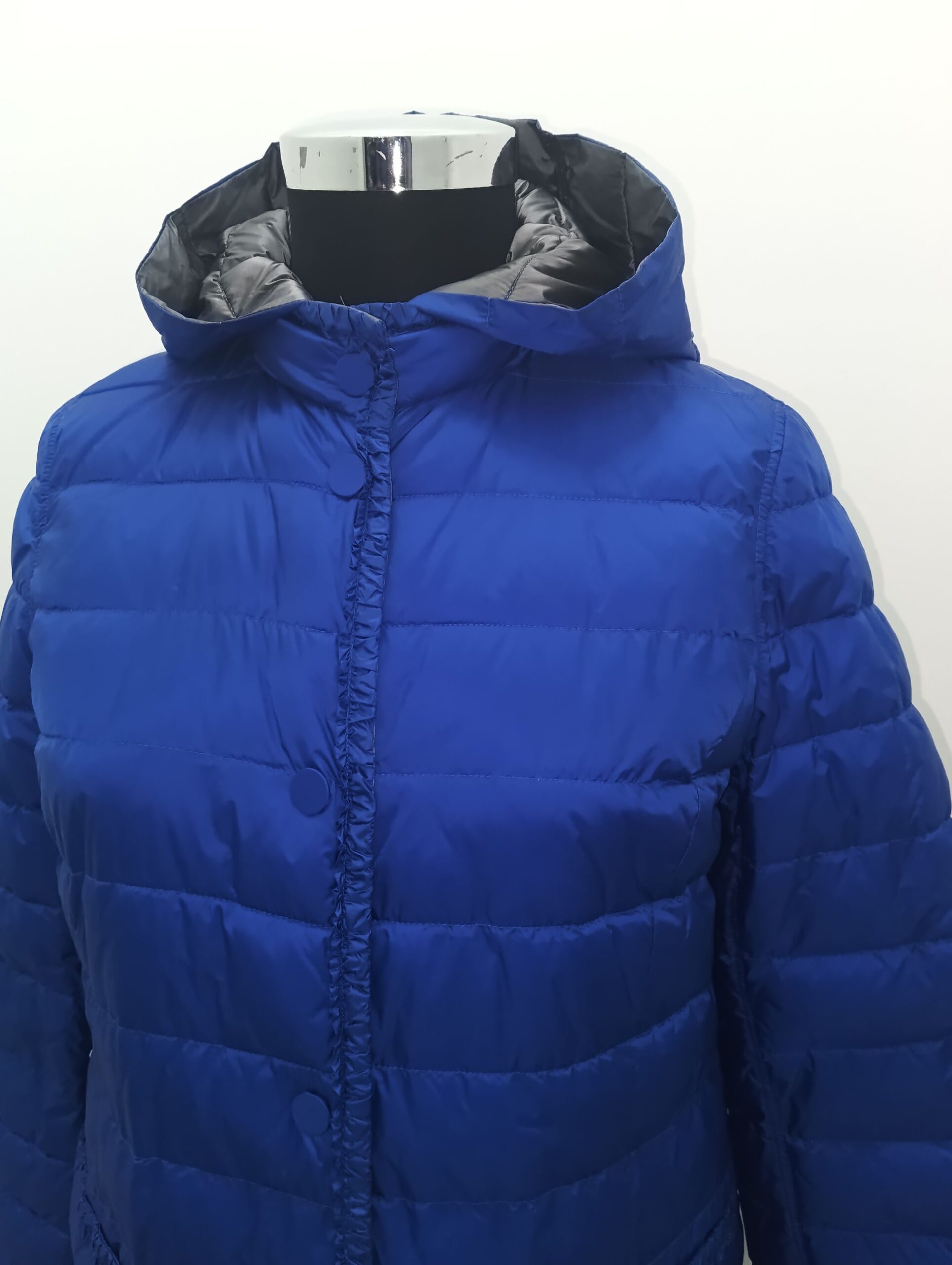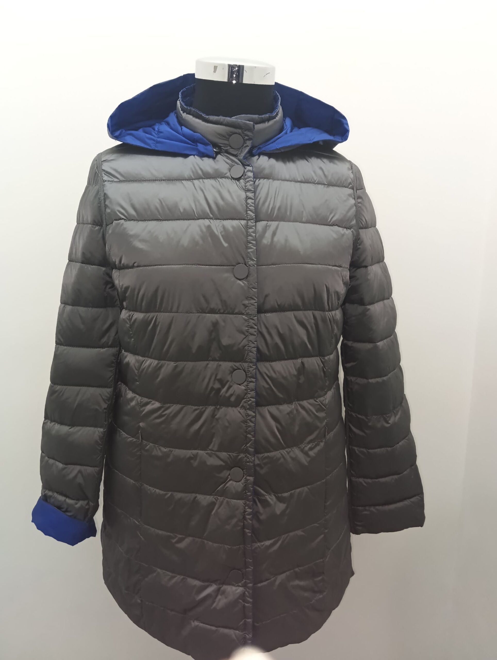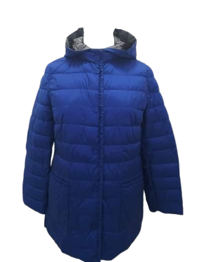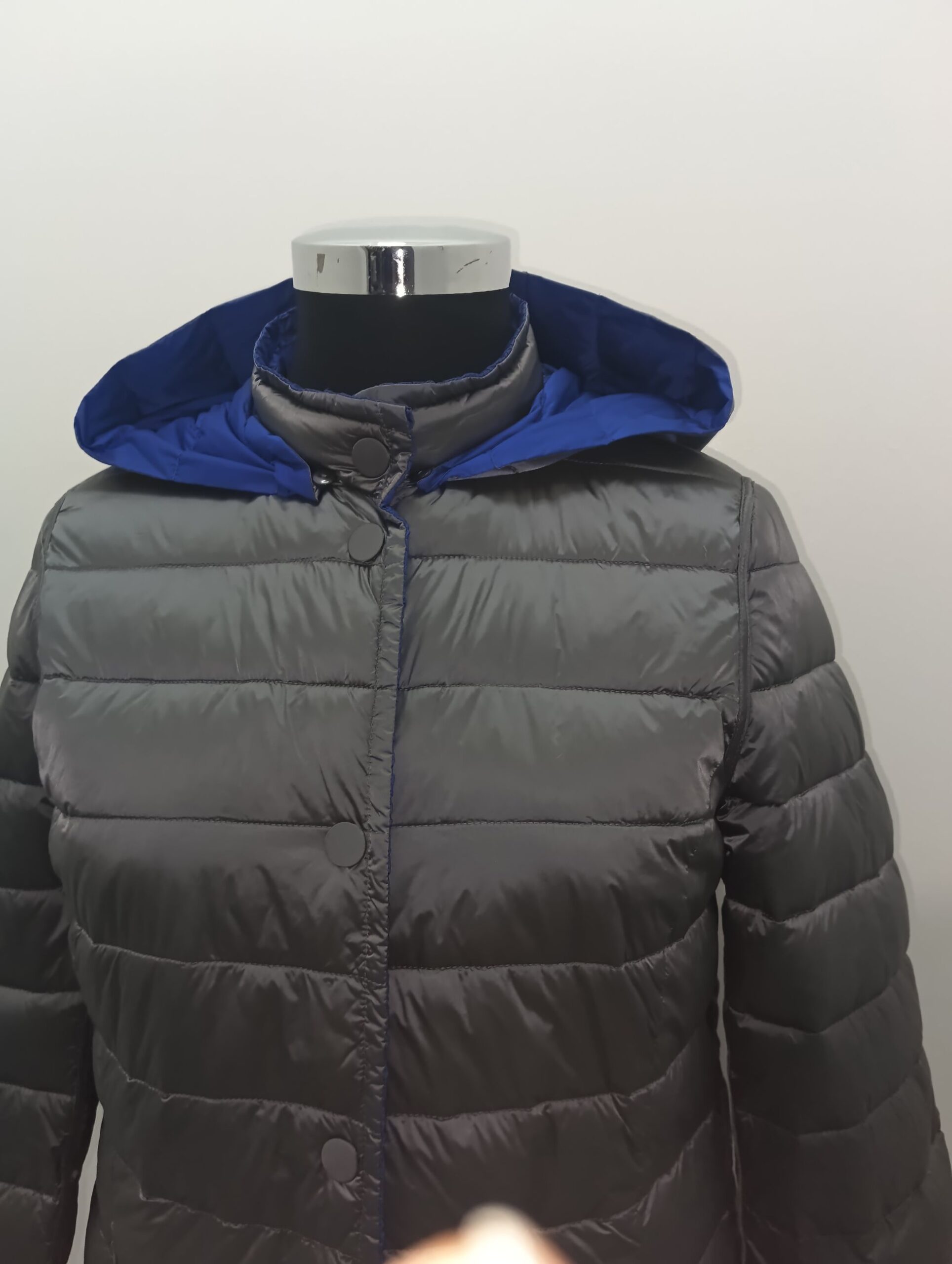 Piumino 100grammi reversibile in azzuro e grigio con cappuccio staccabile e tasche verticali lavorazione lungo il profilo e le tasche chiusura con bottoni clip