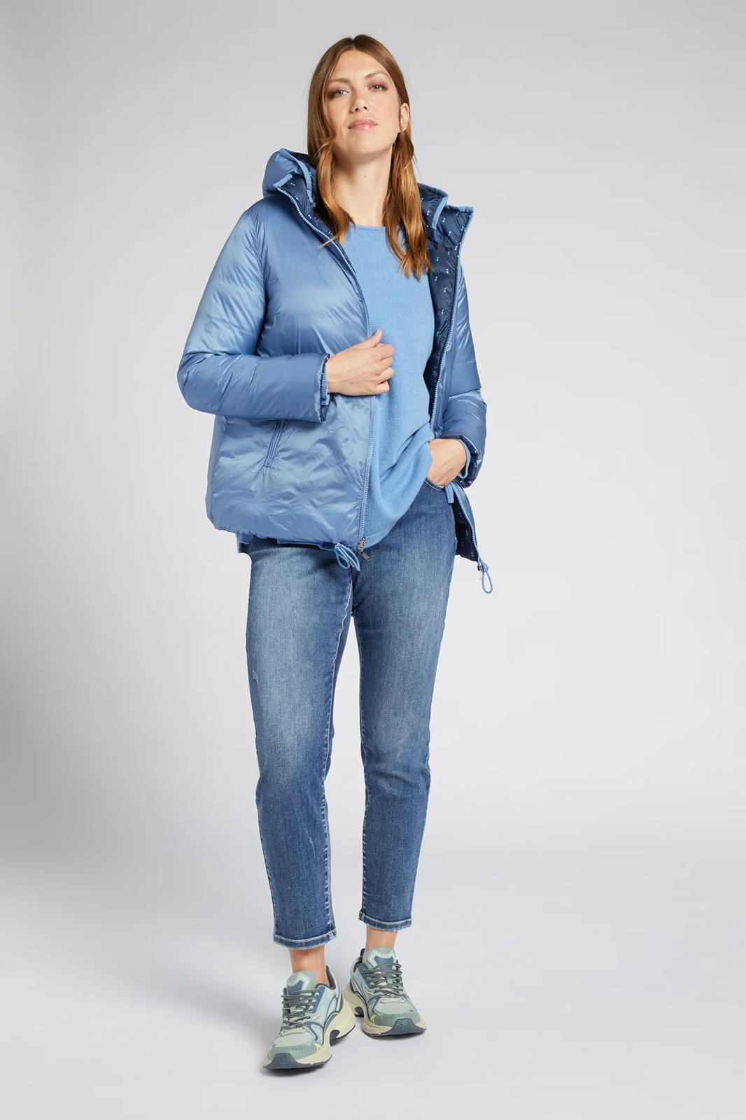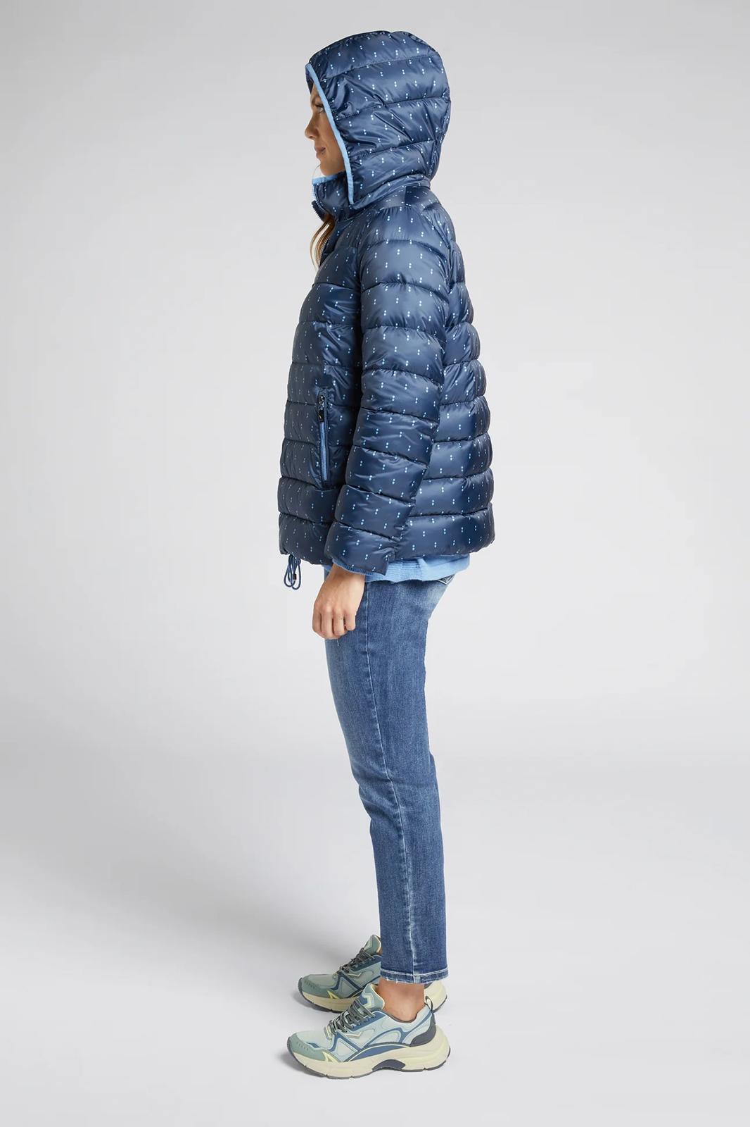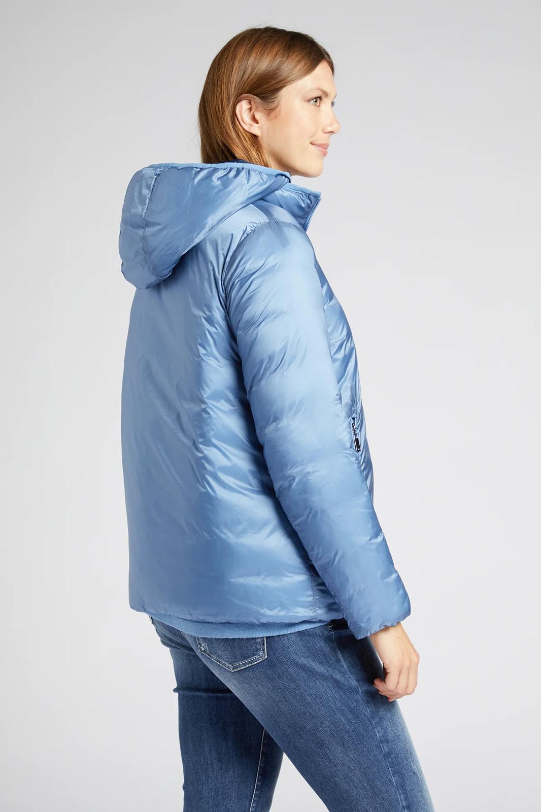 Piumino donna reversibile in tessuto nylon con fantasia blu esterna e tinta unita cielo interno tasche con zip e cappuccio staccabile