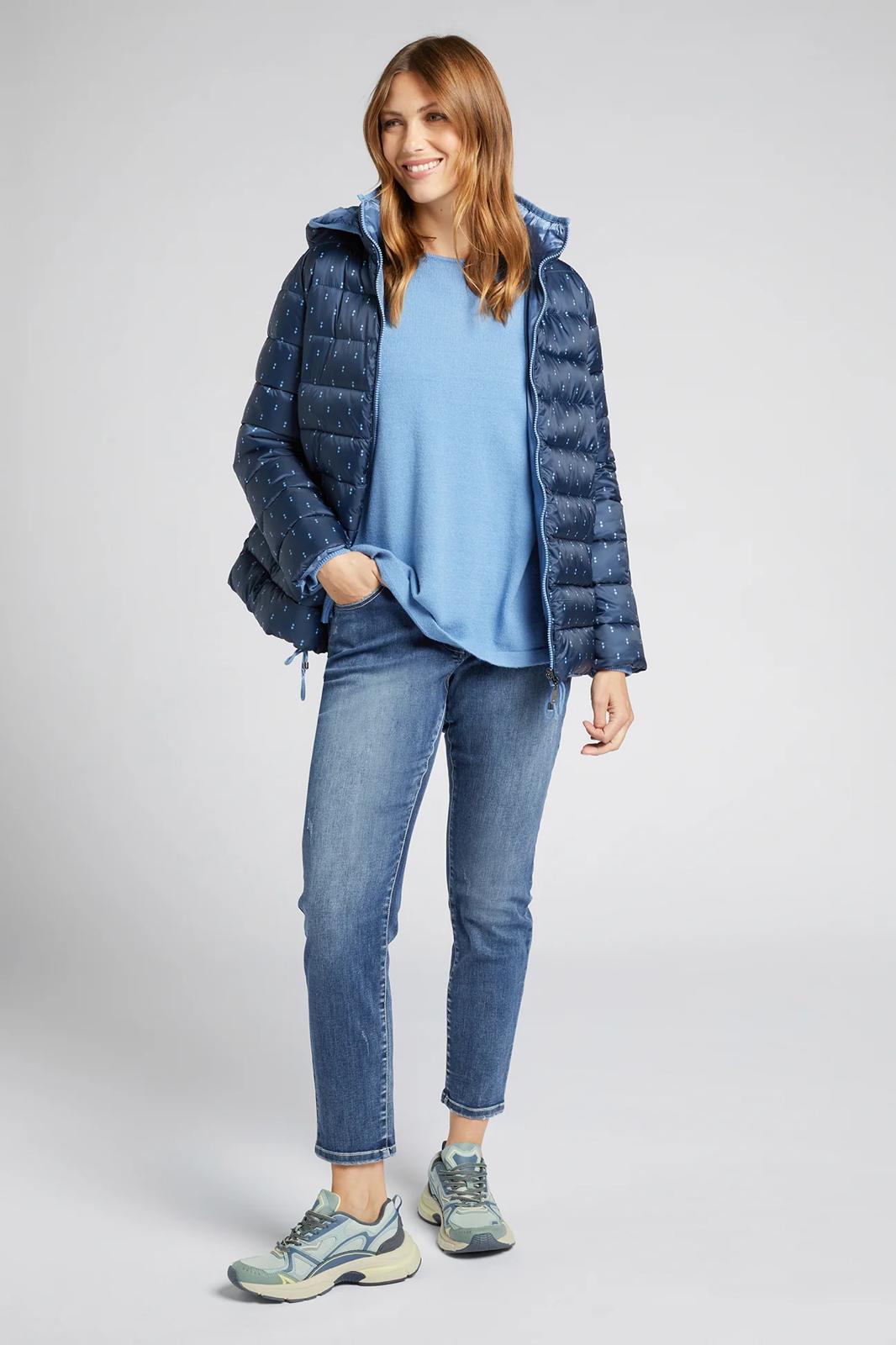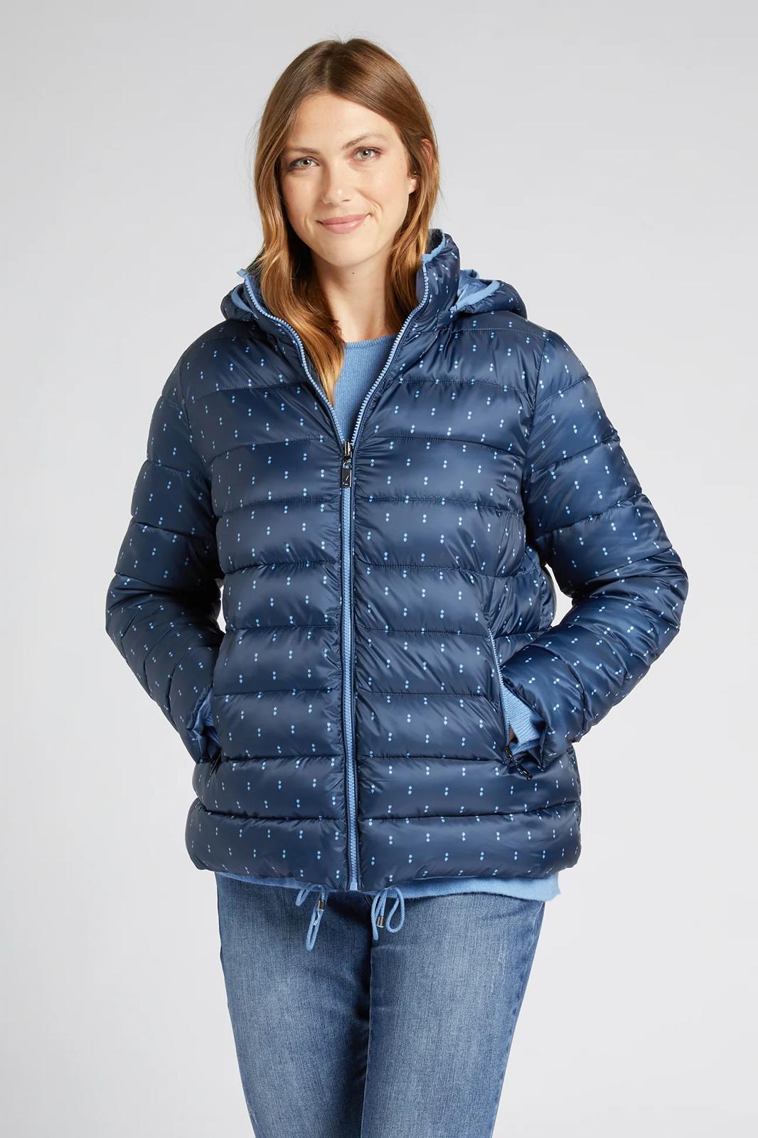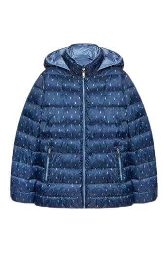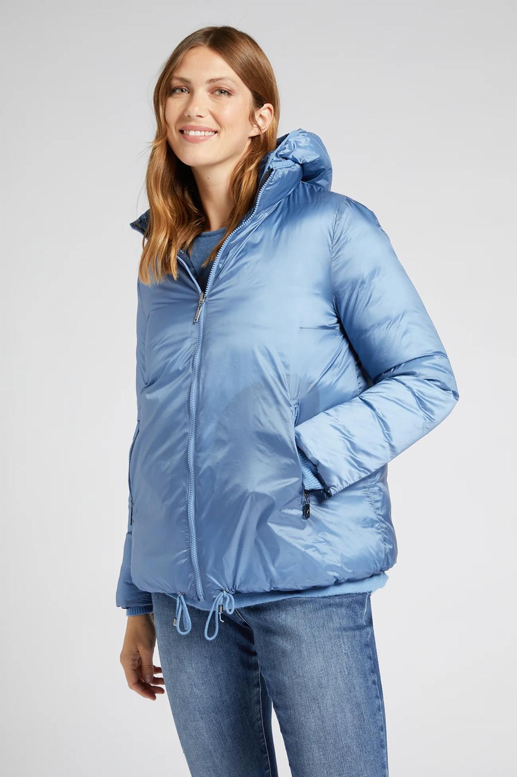 Piumino donna reversibile in tessuto nylon con fantasia blu esterna e tinta unita cielo interno tasche con zip e cappuccio staccabile
