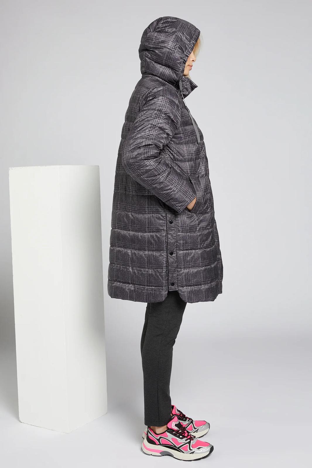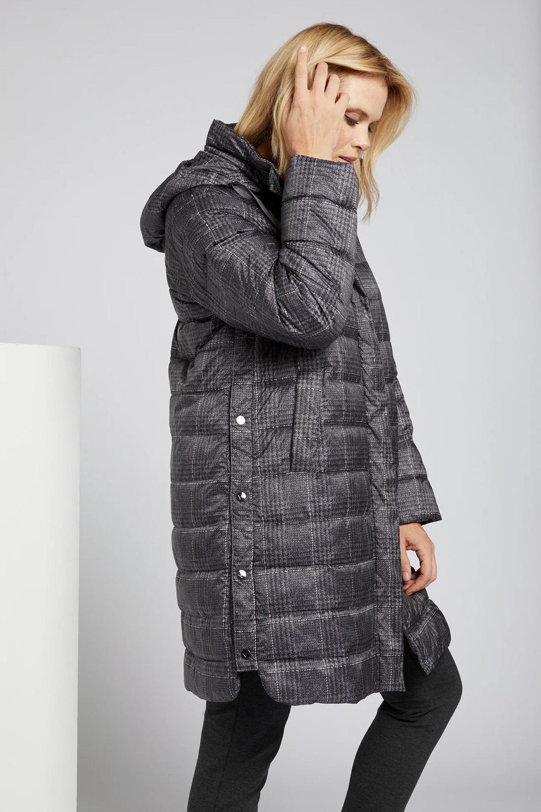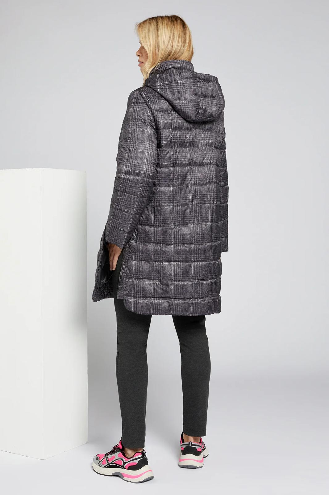Piumino lungo con microfantasia su fondo grigio cappuccio staccabile chiusura con bottoni e cerniera spacchi laterali chiusi con bottoni clip per un maggiore comfort tasche chiuse con bottoni