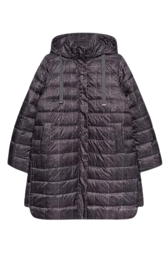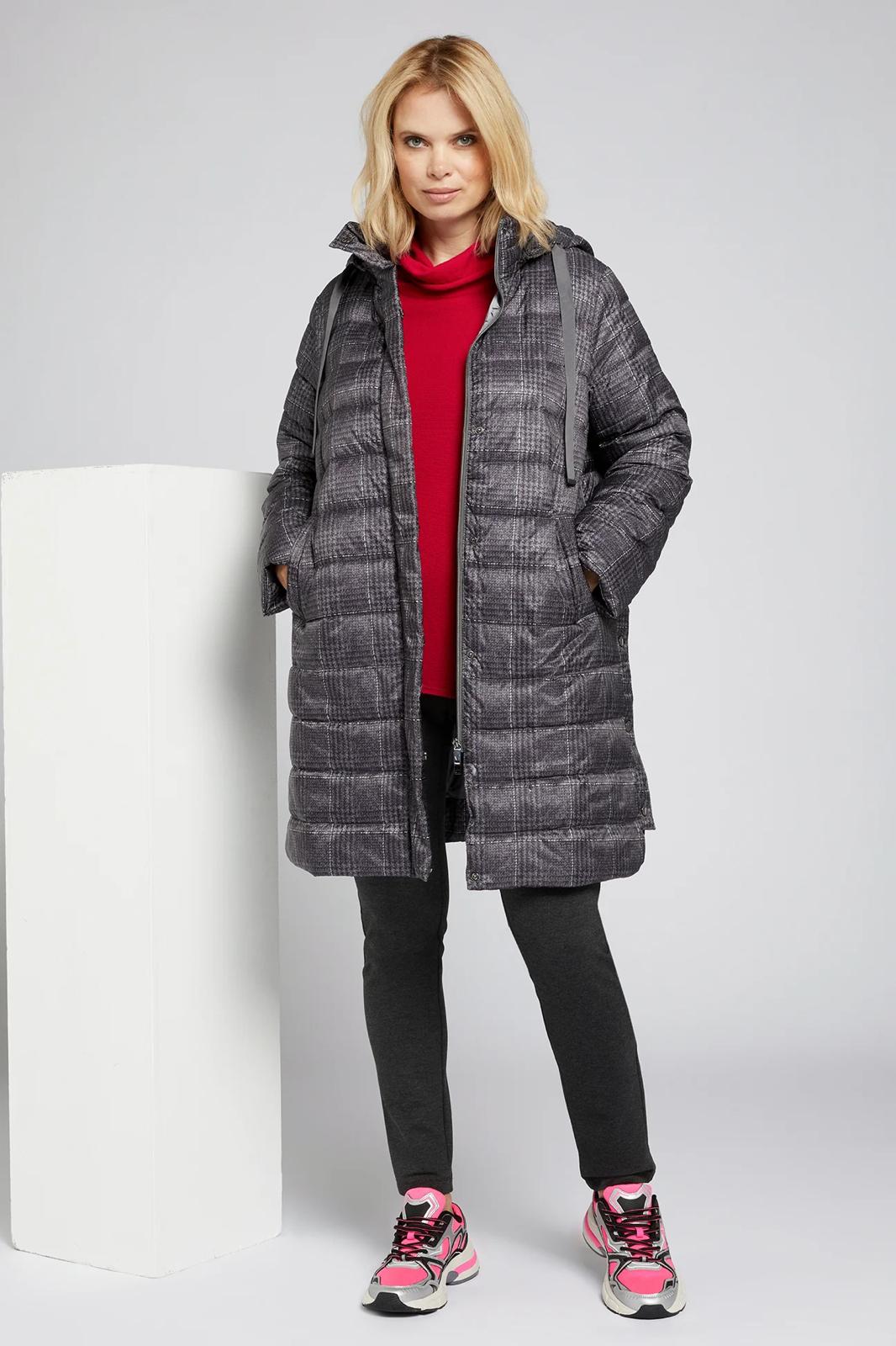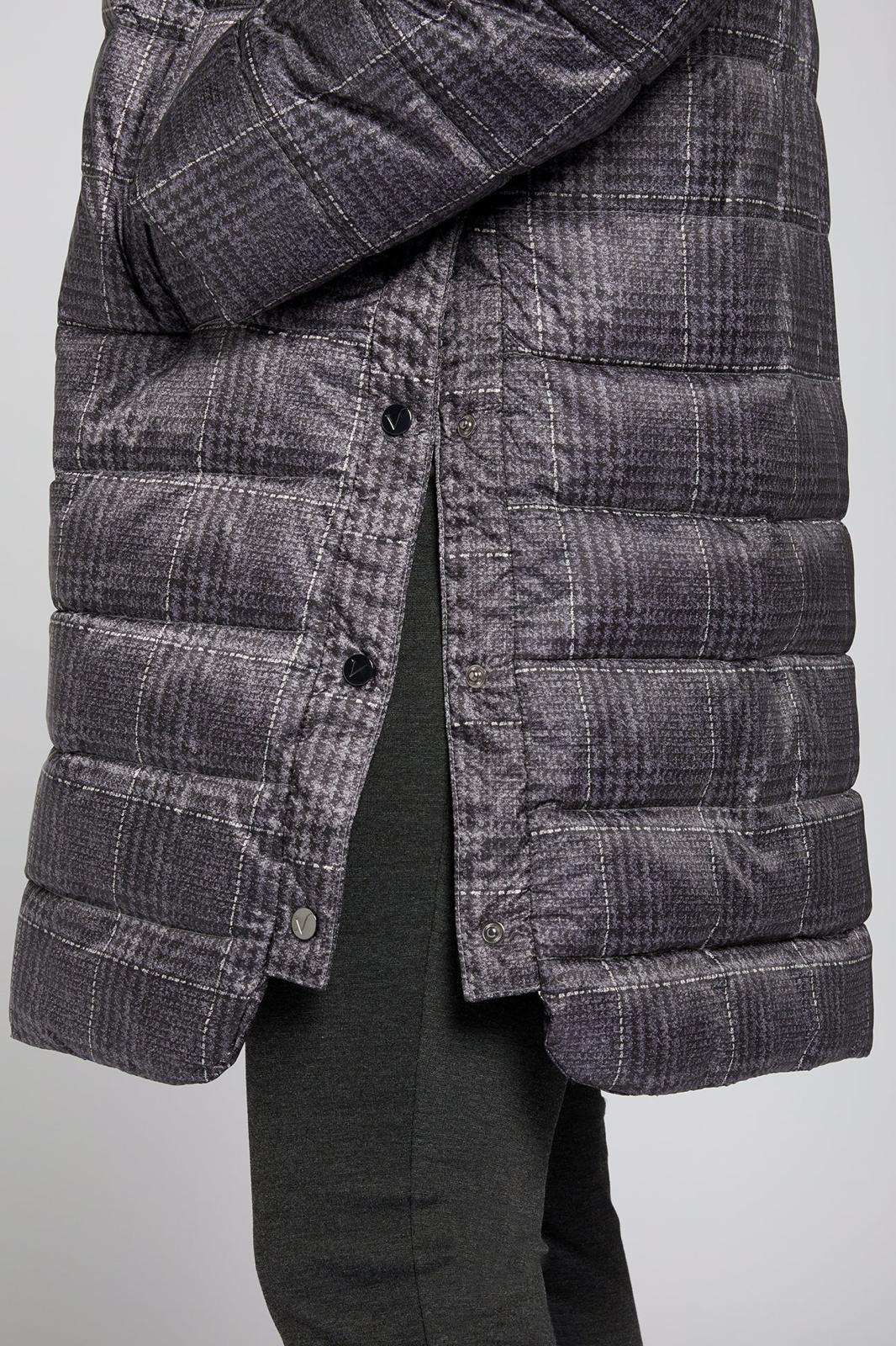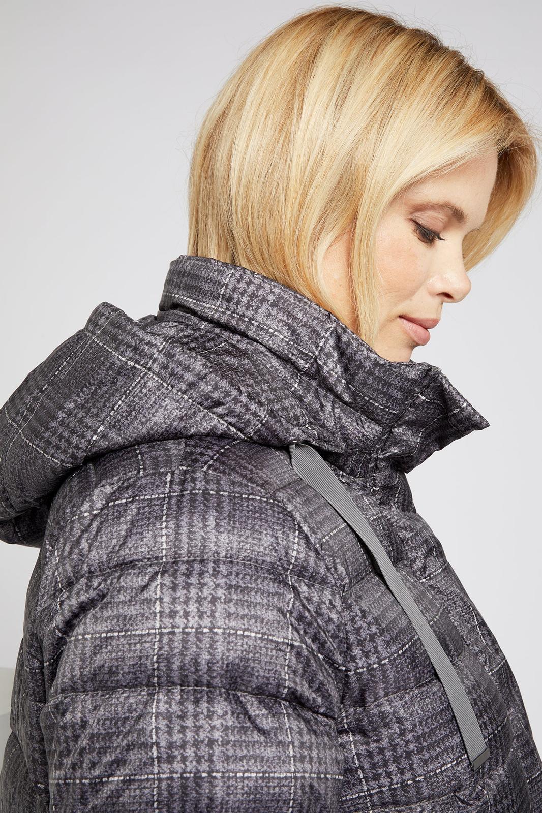 Piumino lungo con microfantasia su fondo grigio cappuccio staccabile chiusura con bottoni e cerniera spacchi laterali chiusi con bottoni clip per un maggiore comfort tasche chiuse con bottoni