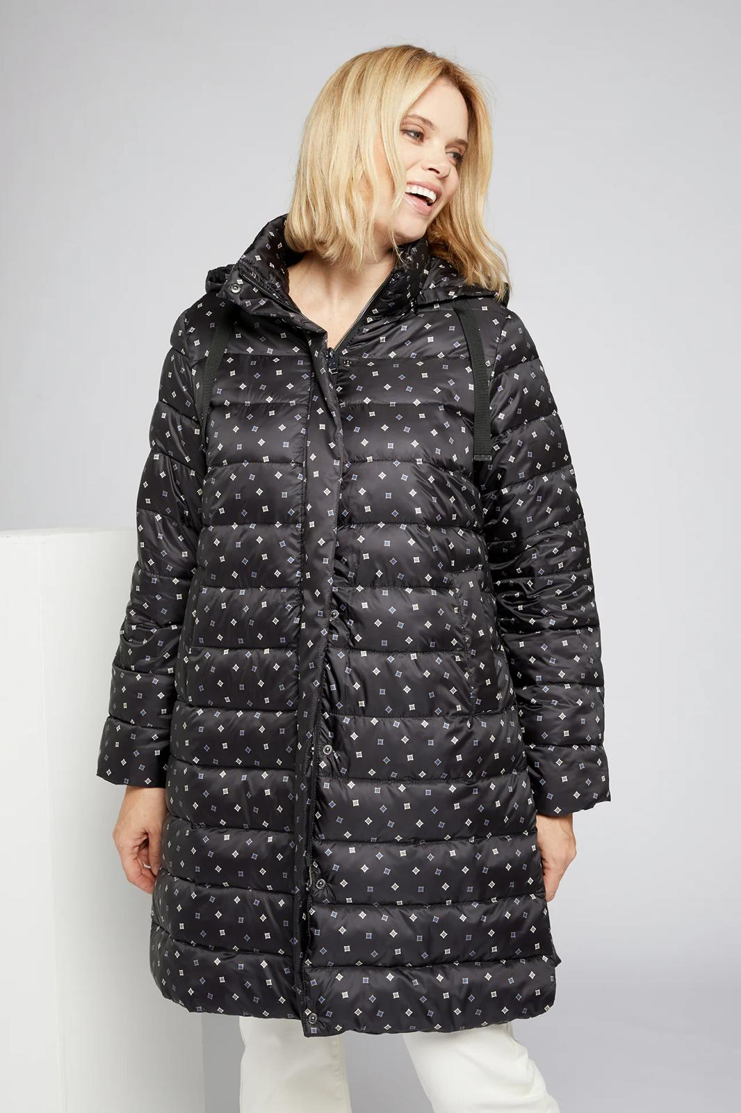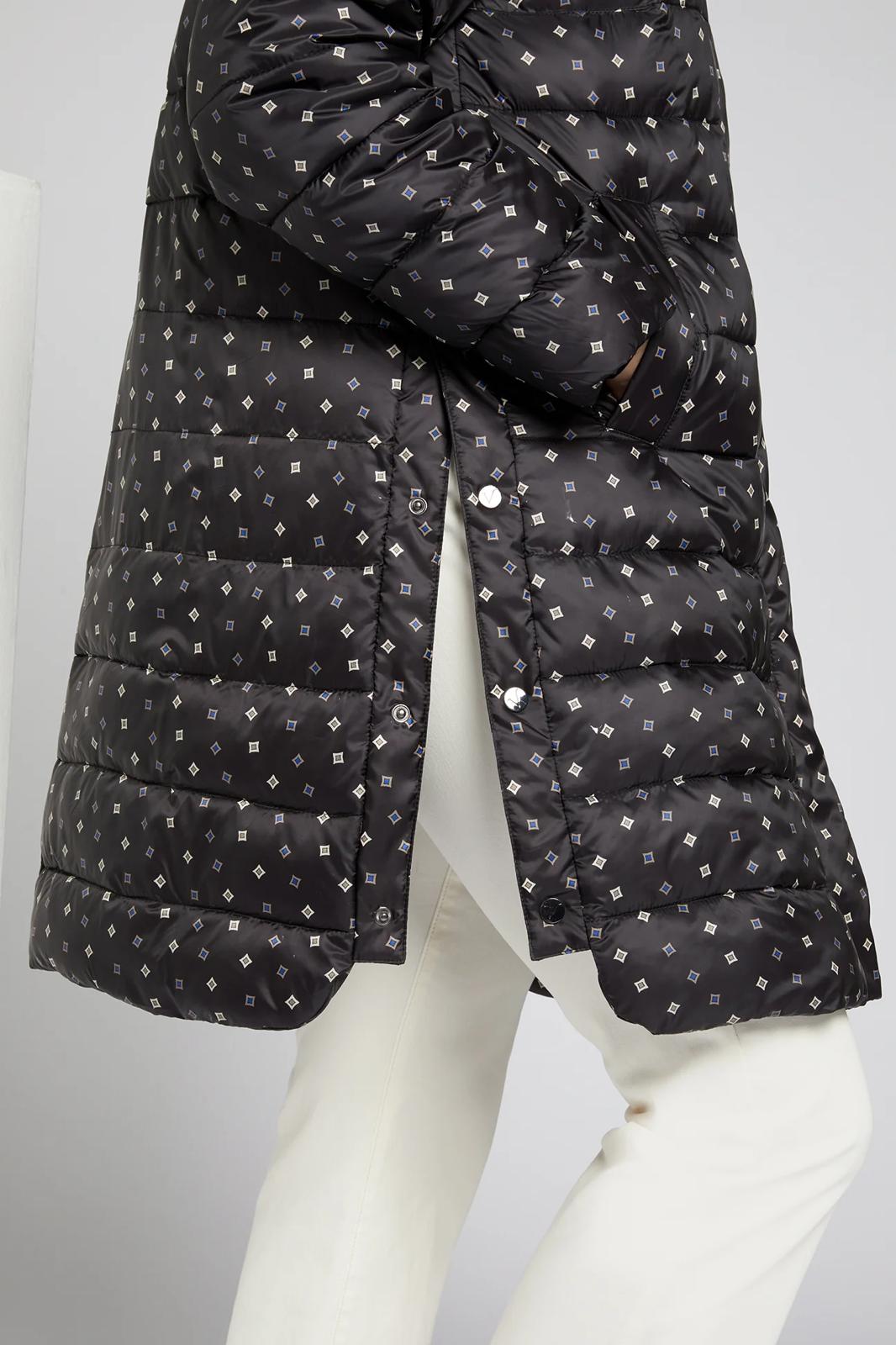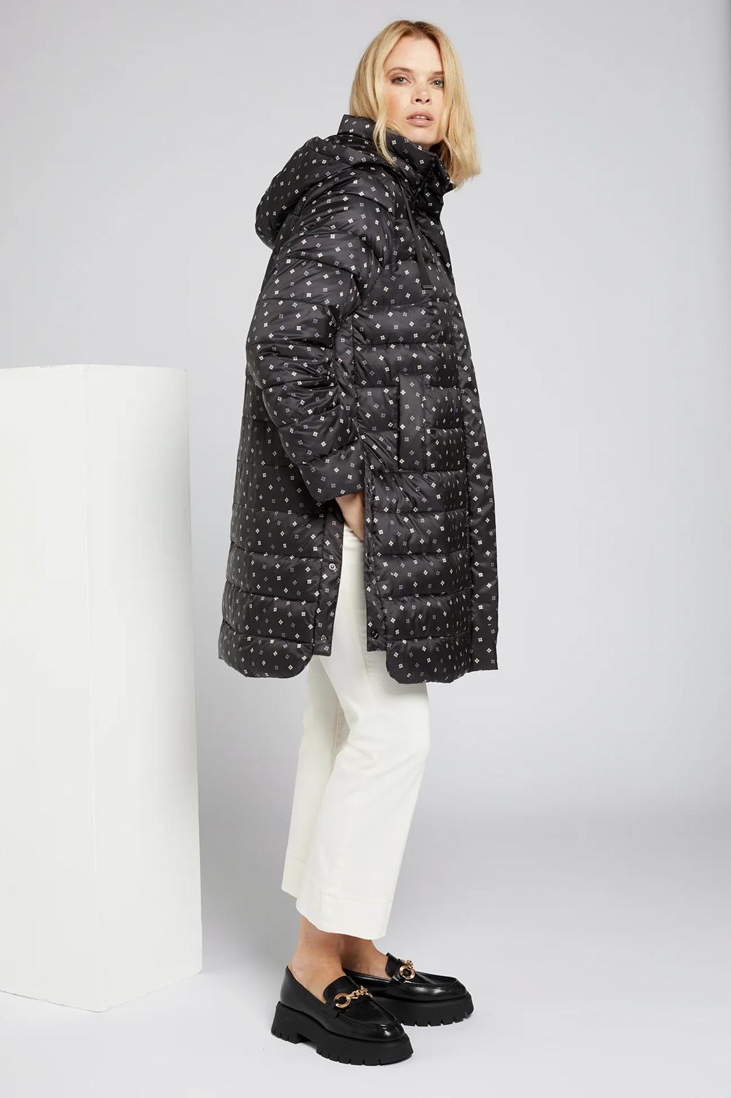 Piumino lungo con microfantasia su fondo nero cappuccio staccabile chiusura con bottoni e cerniera spacchi laterali chiusi con bottoni clip per un maggiore comfort tasche chiuse con bottoni