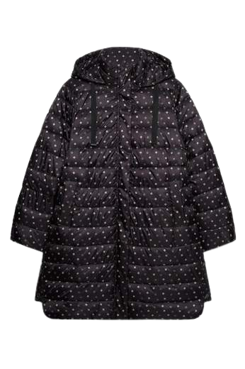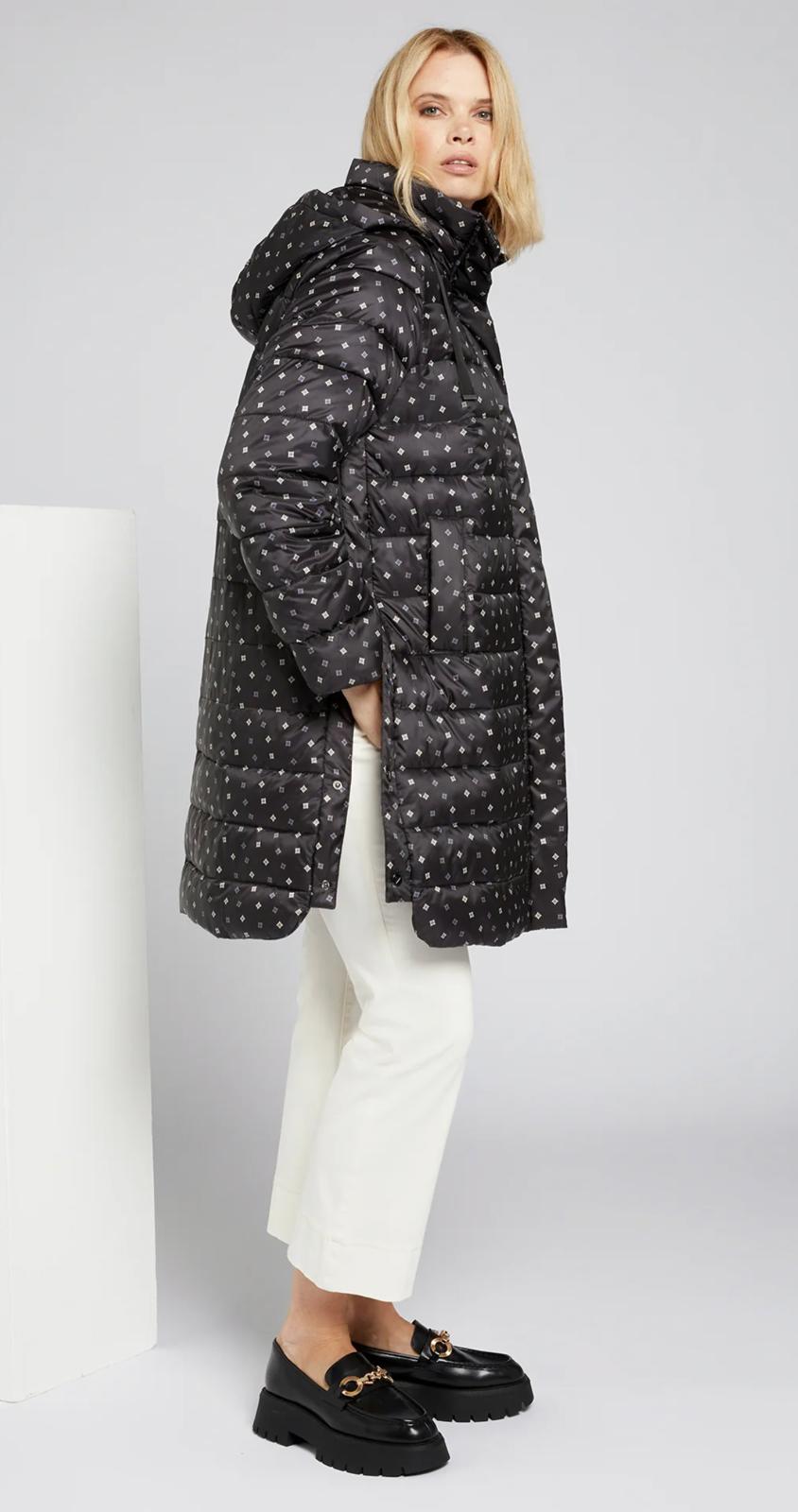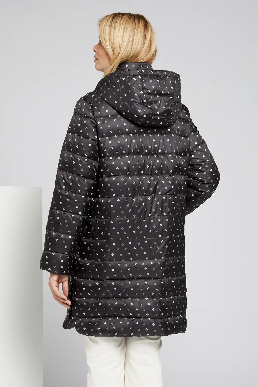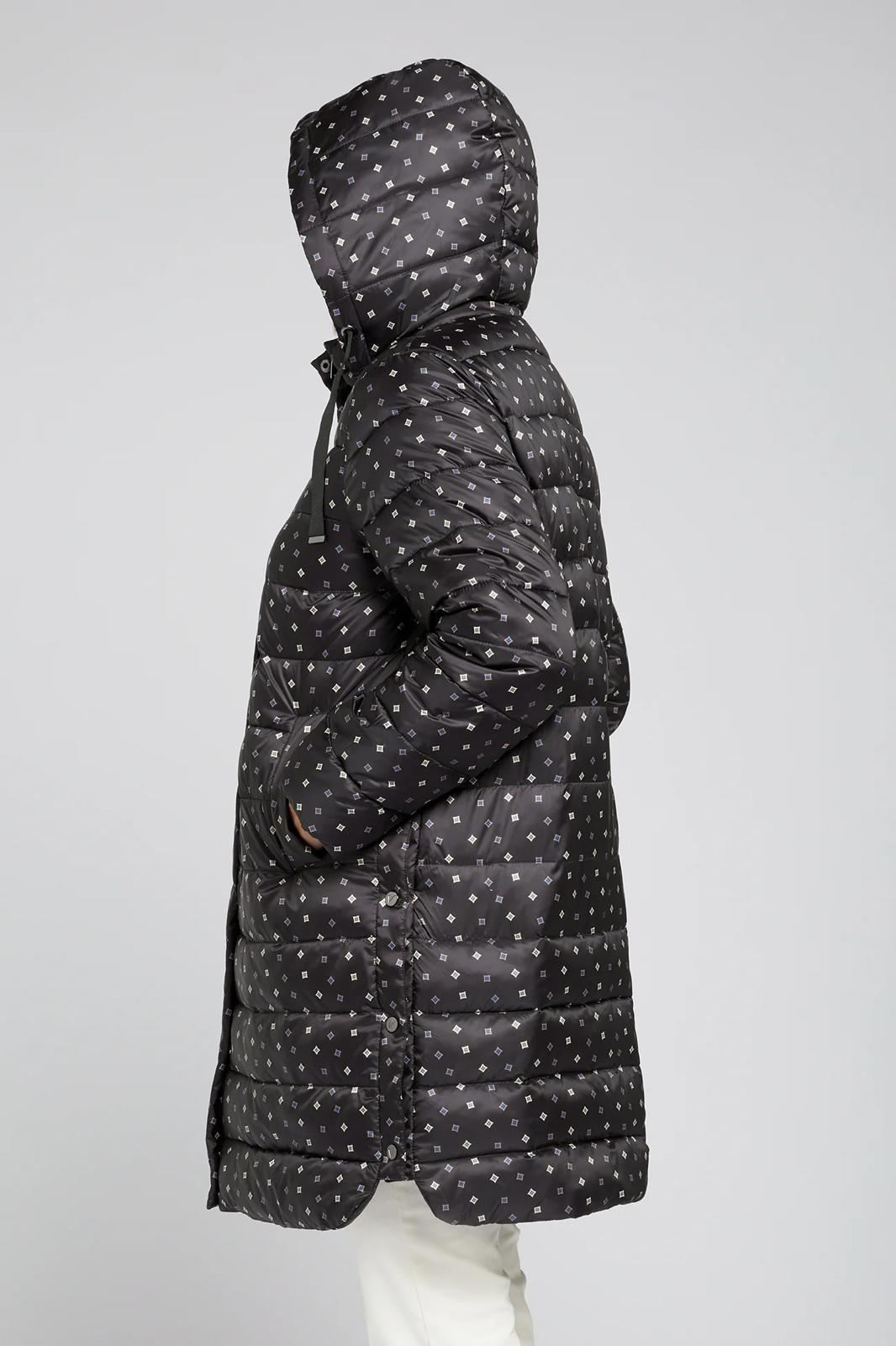 Piumino lungo con microfantasia su fondo nero cappuccio staccabile chiusura con bottoni e cerniera spacchi laterali chiusi con bottoni clip per un maggiore comfort tasche chiuse con bottoni