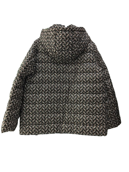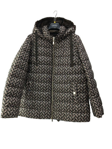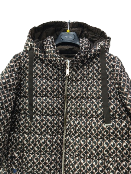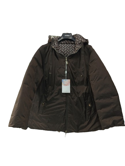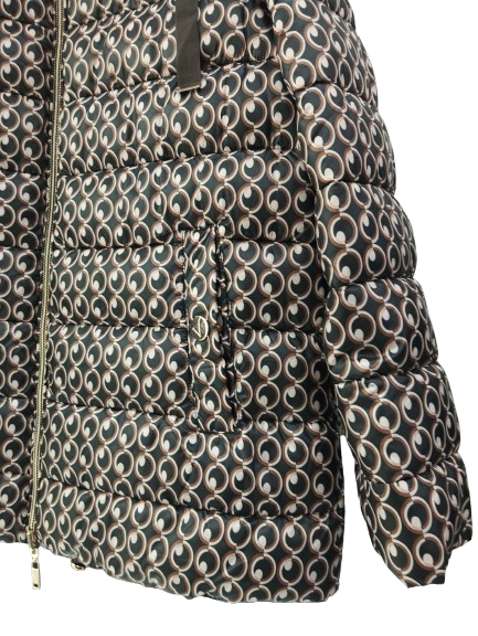 Piumino reversibile in tessuto tecnico, parte esterna stampata e parte interna unita. Linea leggermente ad “A” con coulisse regolabile sul fondo. Chiusura con zip doppio cursore, cappuccio staccabile con coulisse in gros grain, tasche chiuse da bottone automatico. Esterno trapuntato ed interno liscio. Imbottitura in fake down. Accessori con galvanica light gold.