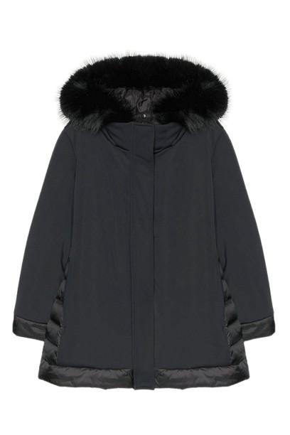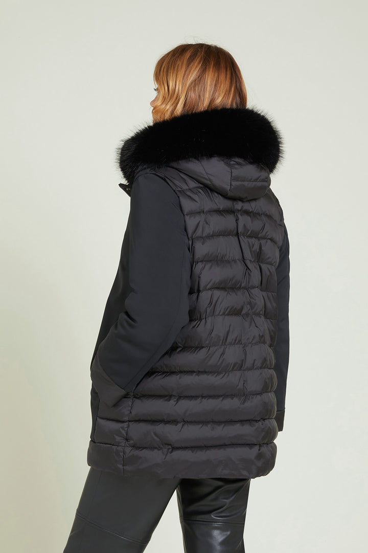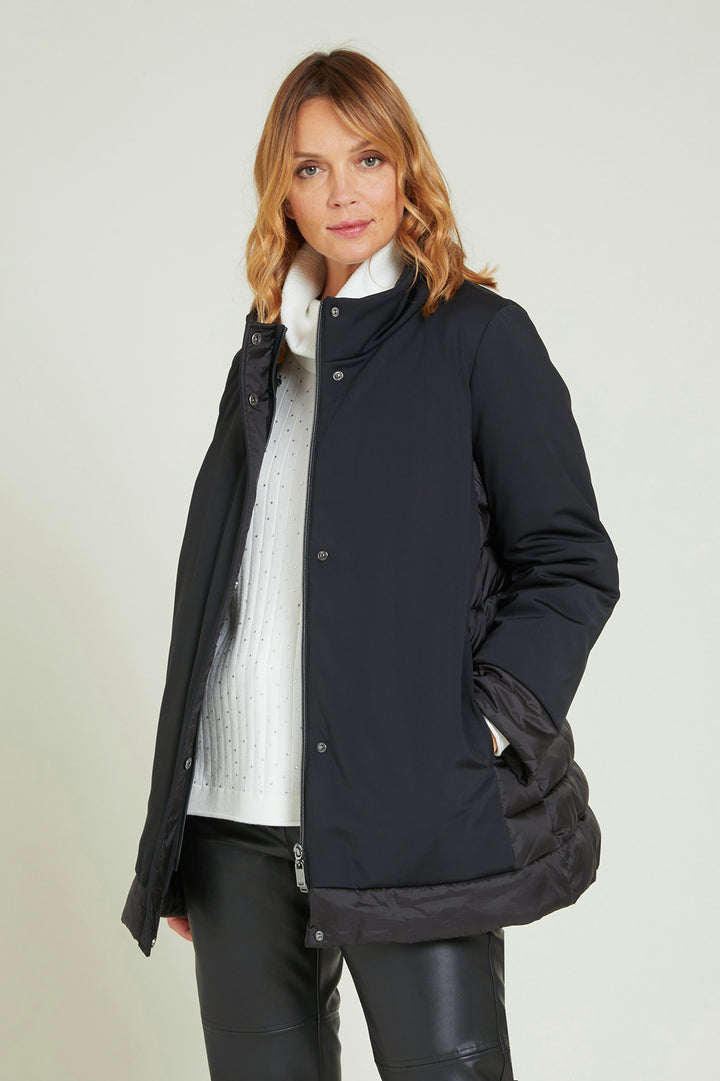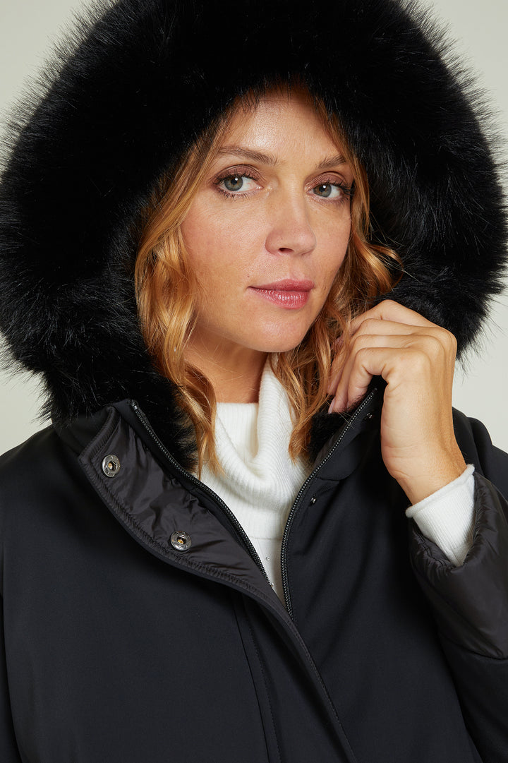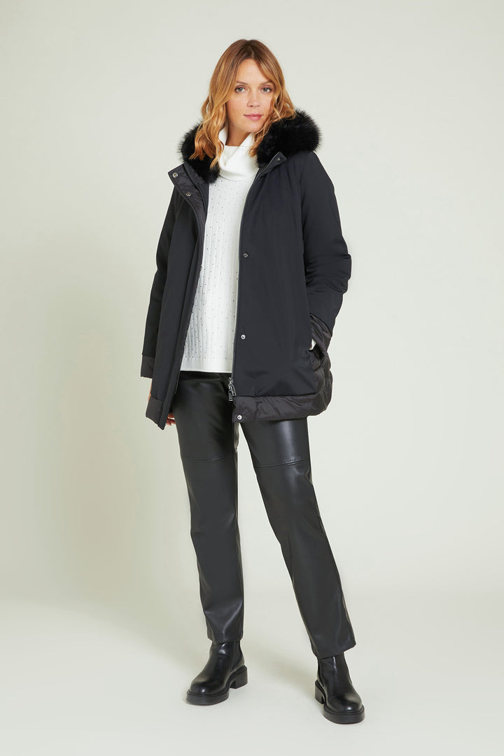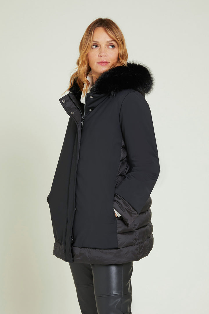 Cappotto in tessuto tecnico elasticizzato dalla linea dritta .collo a listino cappuccio staccabile.Tasche e pattina chiuse da bottone .Particolari in tessuto tecnico light trapuntato con imbottitura fake down
