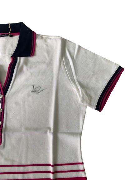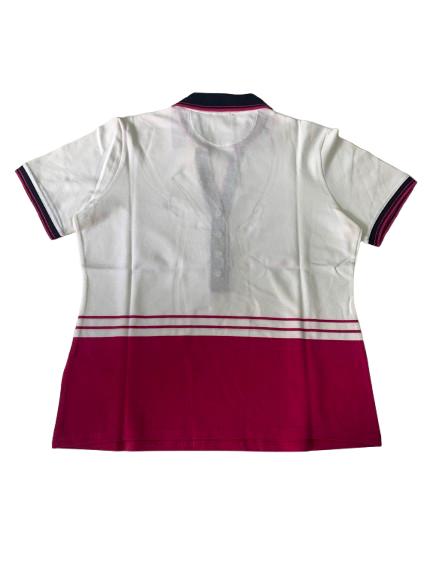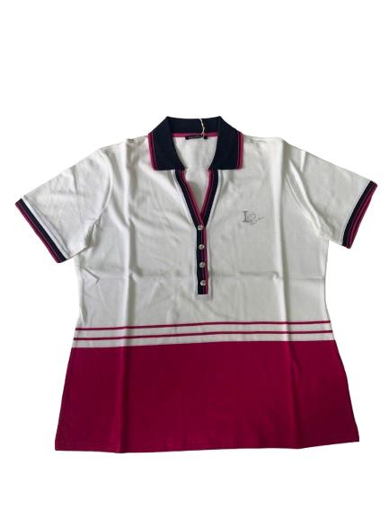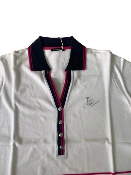 Polo donna Luisa Viola mezza manica in cotone fondo bianco con contrasto blu e fuxia abbottonato con ciappe e logo altezza cuore