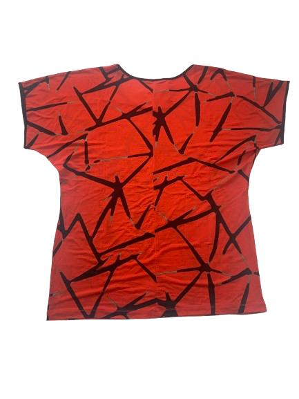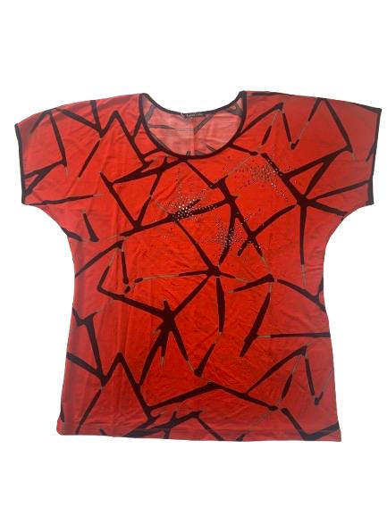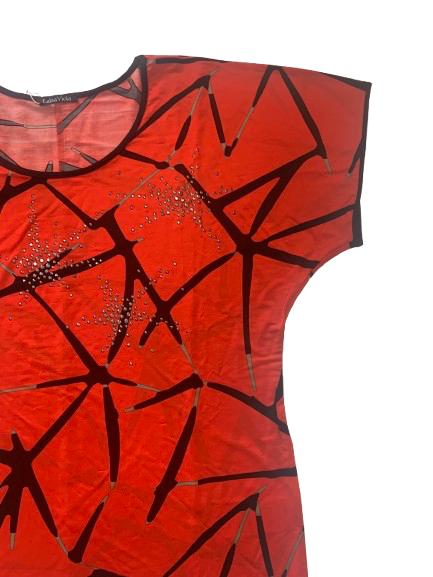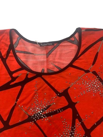 Blusa donna Luisa Viola in viscosa mezza manica fantasia nera su fondo arancio linea scivolosa impreziosita da strass metallici scollo ampio manica raglan