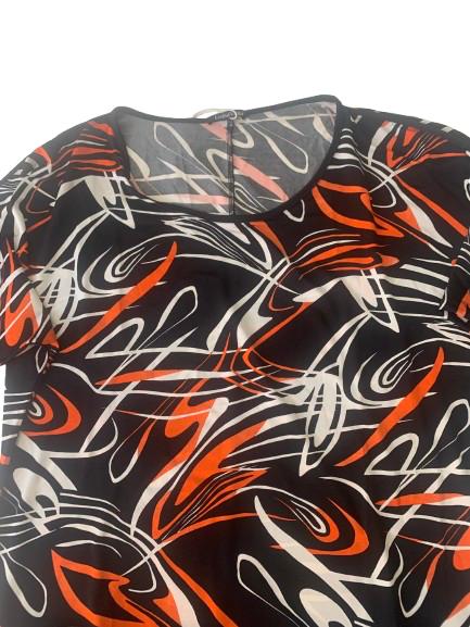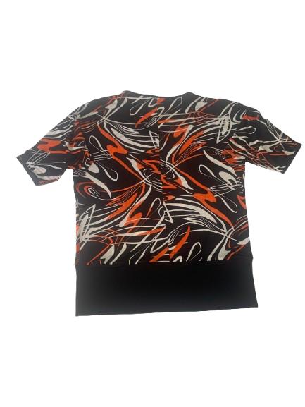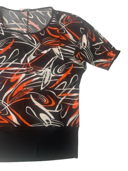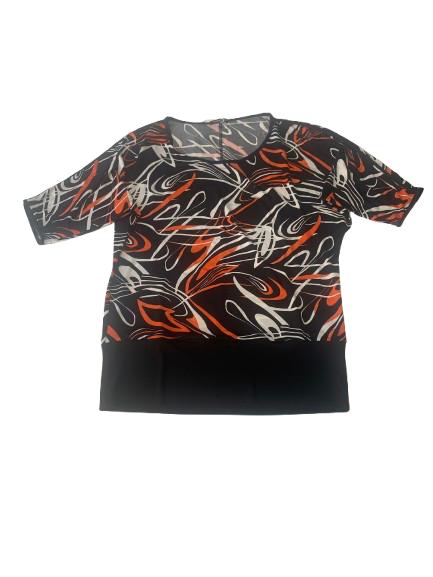 Maximaglia donna Luisa Viola in viscosa manica 3/4 con stampa arancio e bianco su fondo nero fascia sul fondo tinta unita e profilo sulle spalle
